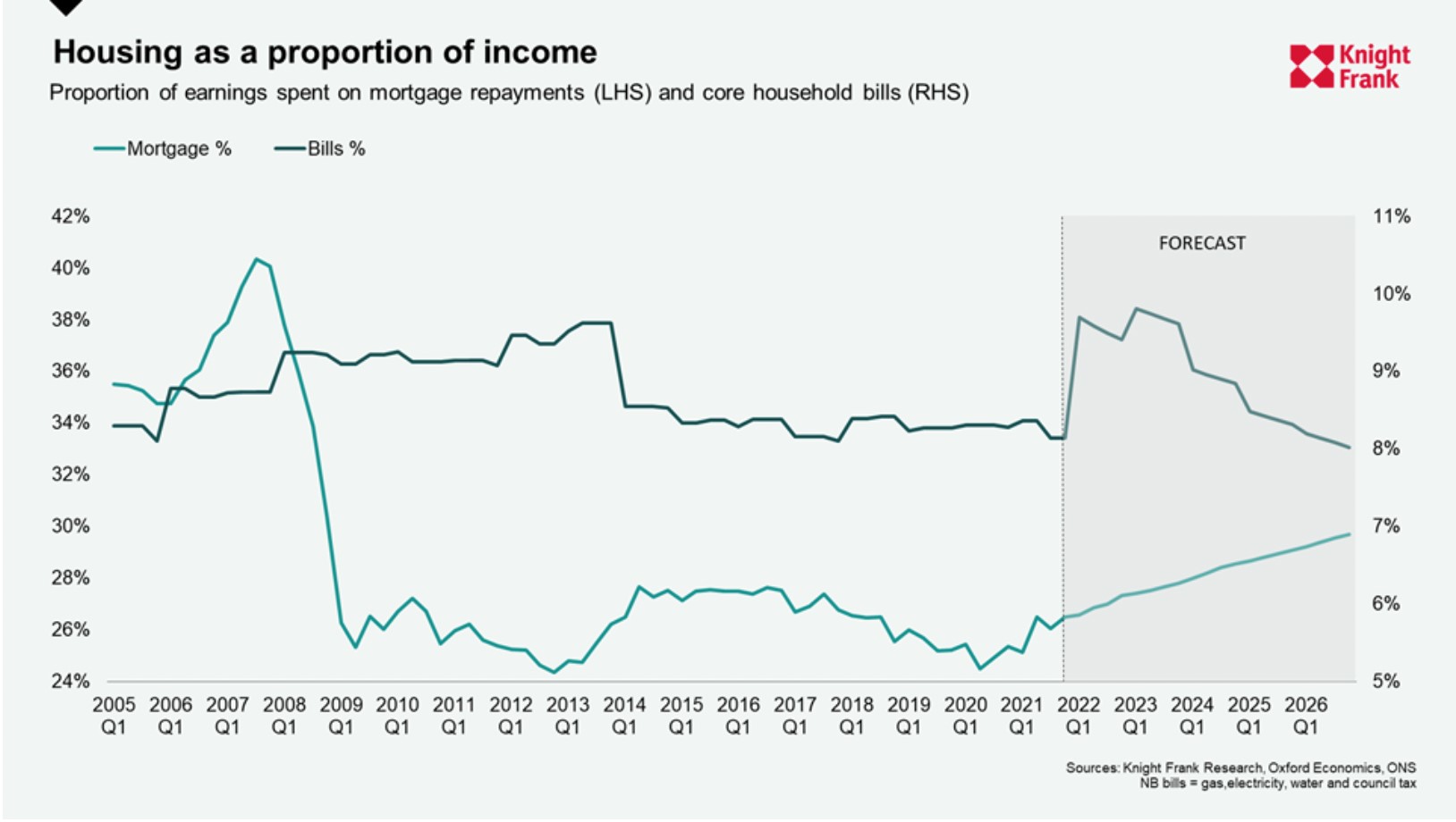 Utilising our latest house price forecasts and Oxford Economics forecasts for mortgage rates and wage growth, we expect the proportion of income spent on servicing a mortgage to rise to 30% by 2026. Meanwhile, spending on "core" bills will rise to 10% next year, from 8% today, before falling back again as energy prices normalise.