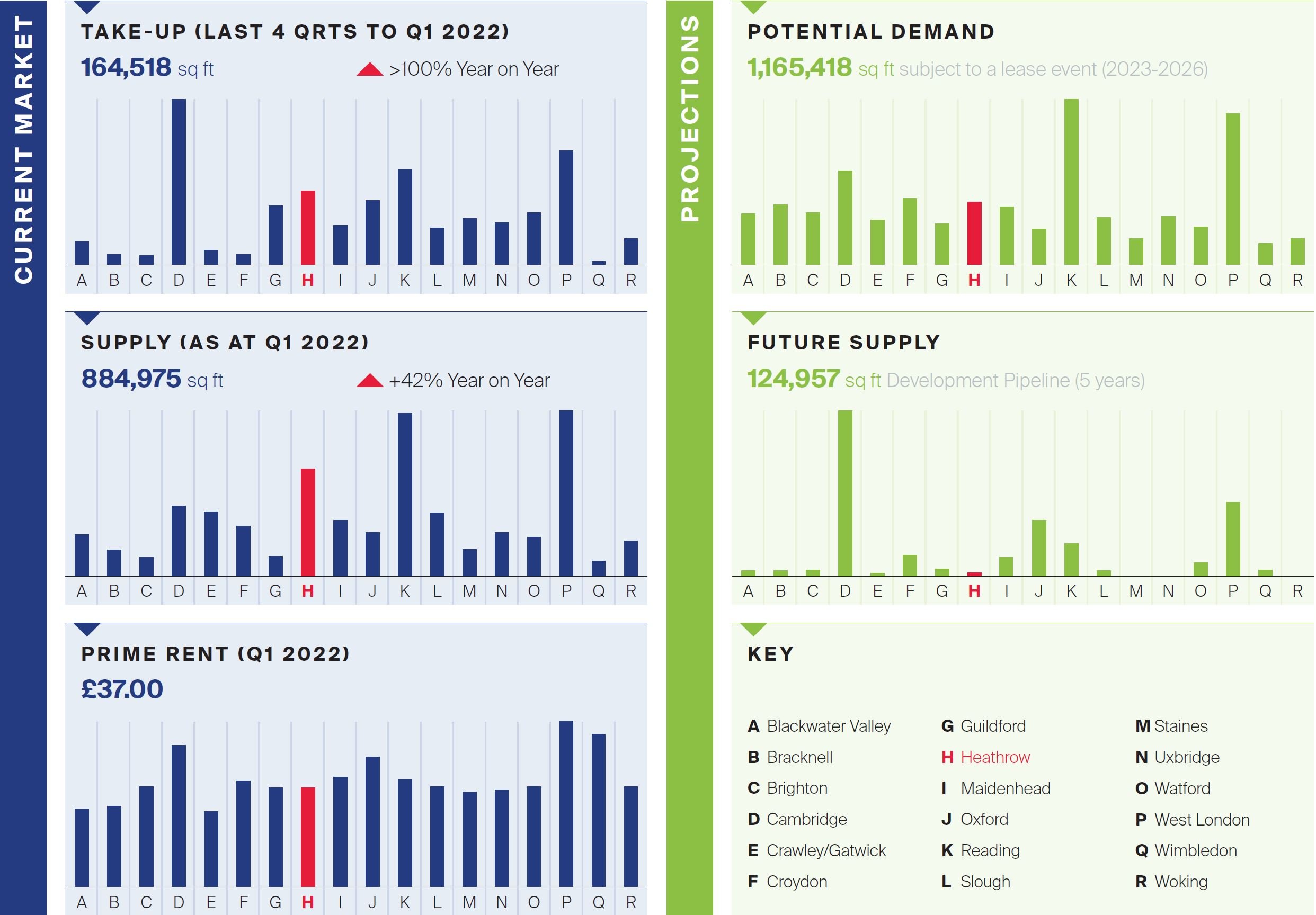 Excluding the letting to payment solutions firm Verifone at Mondial House, there has been a sustained erosion of the Bath Road office market in recent years. Occupiers now place greater emphasis on the two main business parks of Stockley Park and Bedfont Lakes. 2021 marked the largest letting in Stockley Park for 30 years with the entirety of the 151,000 sq ft of The Bower let to Canon for its UK and European headquarters.