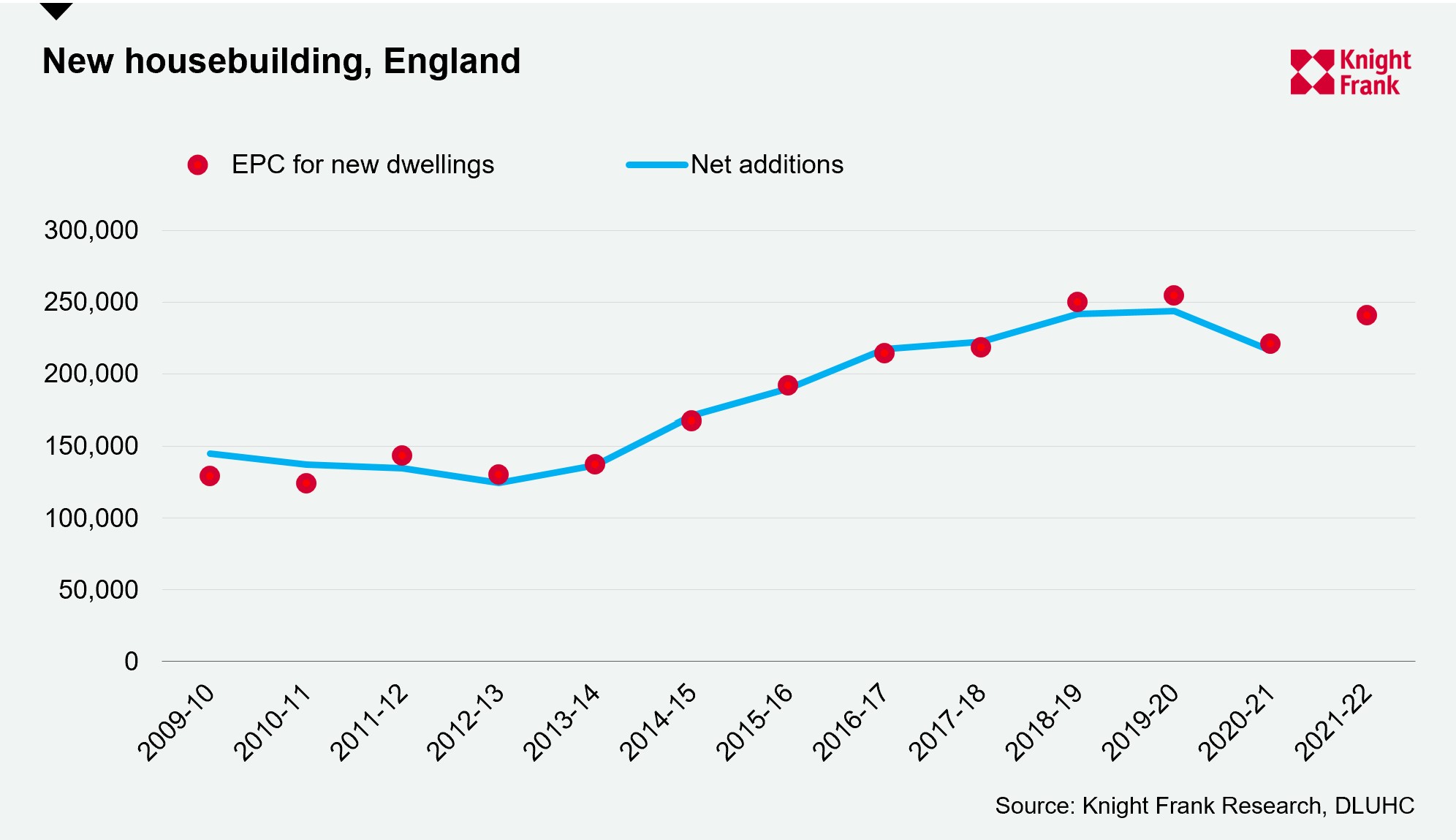 In 2021/22 there were 240,944 EPCs recorded, suggesting that high levels of housing demand over the past 12 months have contributed to a return to pre-pandemic delivery rates. This will be confirmed once the government releases its net additions figures later this year.
