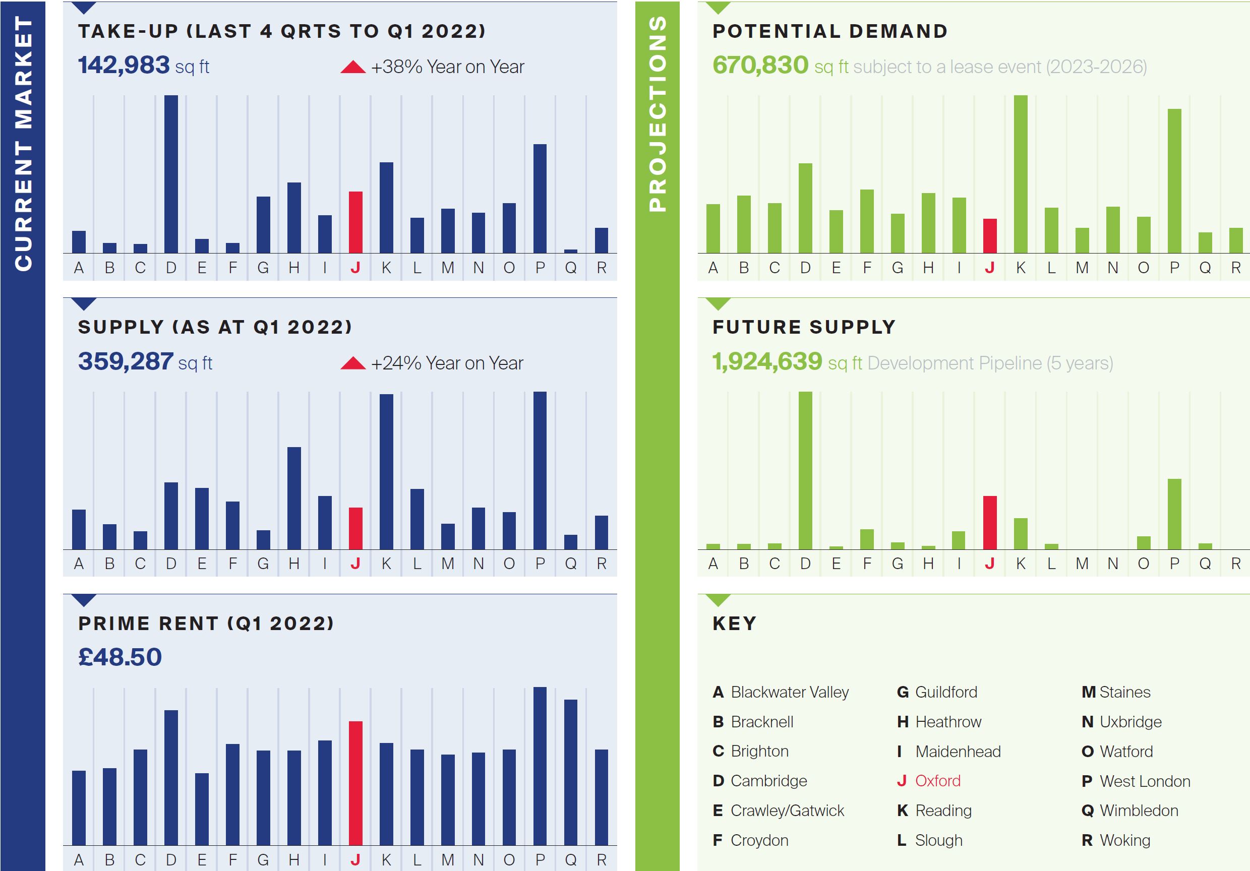 Take up in 2020 tracked +5% above 2019 levels. But 2021 saw take-up skyrocket +95% above 2020 levels: the focus on the edge of town science parks with office space being fashioned for laboratory use. In turn this has driven rents across the city to new levels. Edge of town schemes are now at £35-£40.00 psf with those in the core at mid £40.00’s. Both rental tones will rise but analysis of the market will be complicated by levels of Landlord fit out provided.