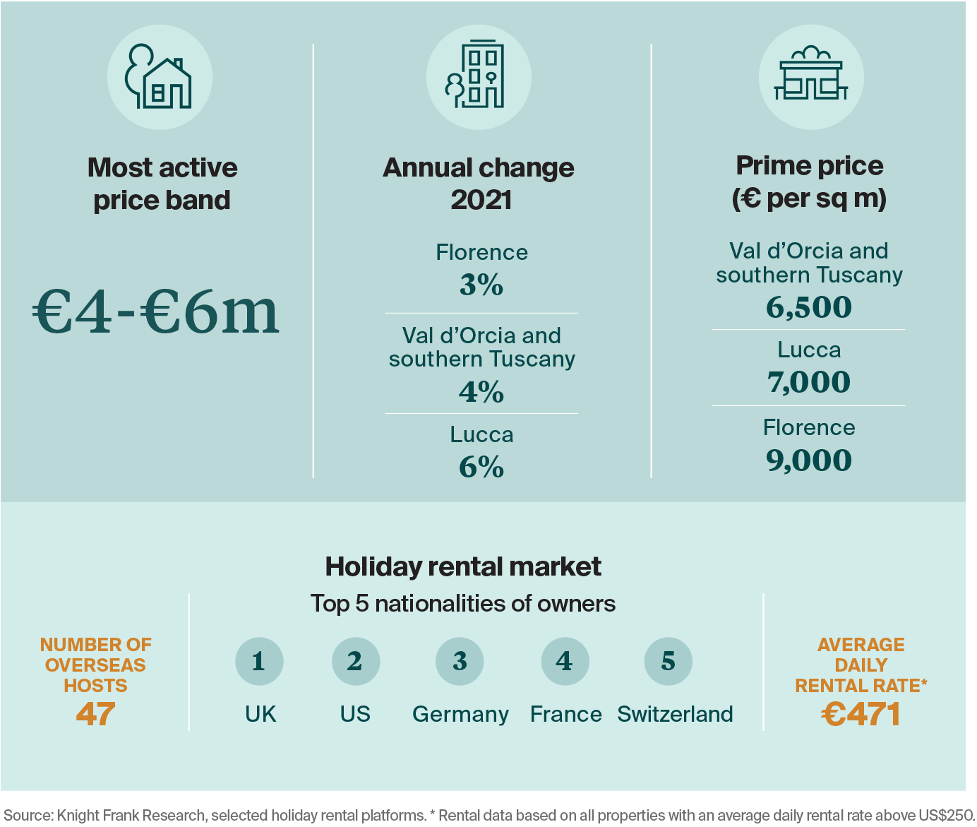 In 2021, Lucca, Val d’Orcia and Florence recorded price growth of 6%, 4% and 3% respectively, as demand strengthened, and travel rules were relaxed.
