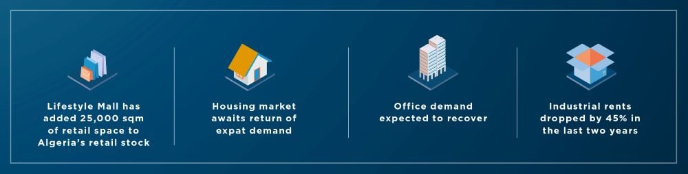 Our optimistic expectation is backed by the expansion of Carrefour in 2020, taking the total retail space occupied by the supermarket giant to 10,500 sqm across two locations. Furthermore, 2021 saw the addition of the 25,000 sqm Lifestyle Mall in Cheraga, which was rapidly leased and houses brands such as Zara, Mango and Massimo Dutti.