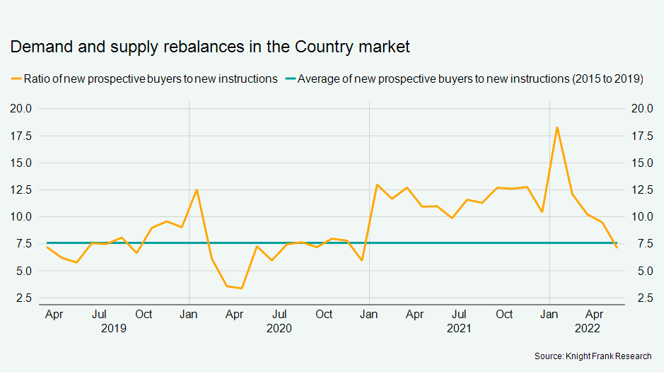 The "race for space" that underpinned a surge in country house prices is ebbing as supply improves relative to demand.