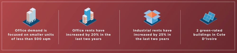 Following the injection of political stability in the wake of the presidential elections in 2020, Abidjan’s real estate market continues to experience growth in most sectors, with a clear focus on higher quality stock by investors and occupiers alike.