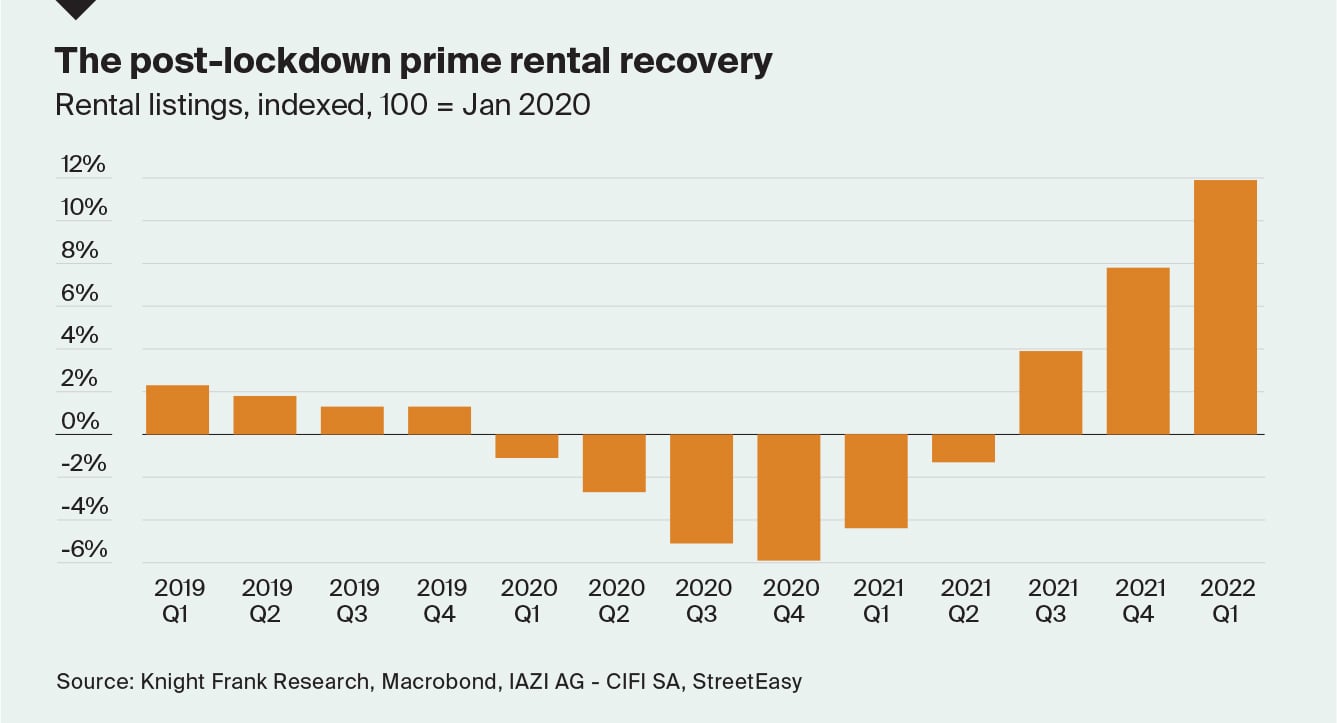 New York and London lead the rankings with rents up 38.5% and 26.4% respectively in the year to Q1 2022, although this largely represents a return to pre-Covid levels.