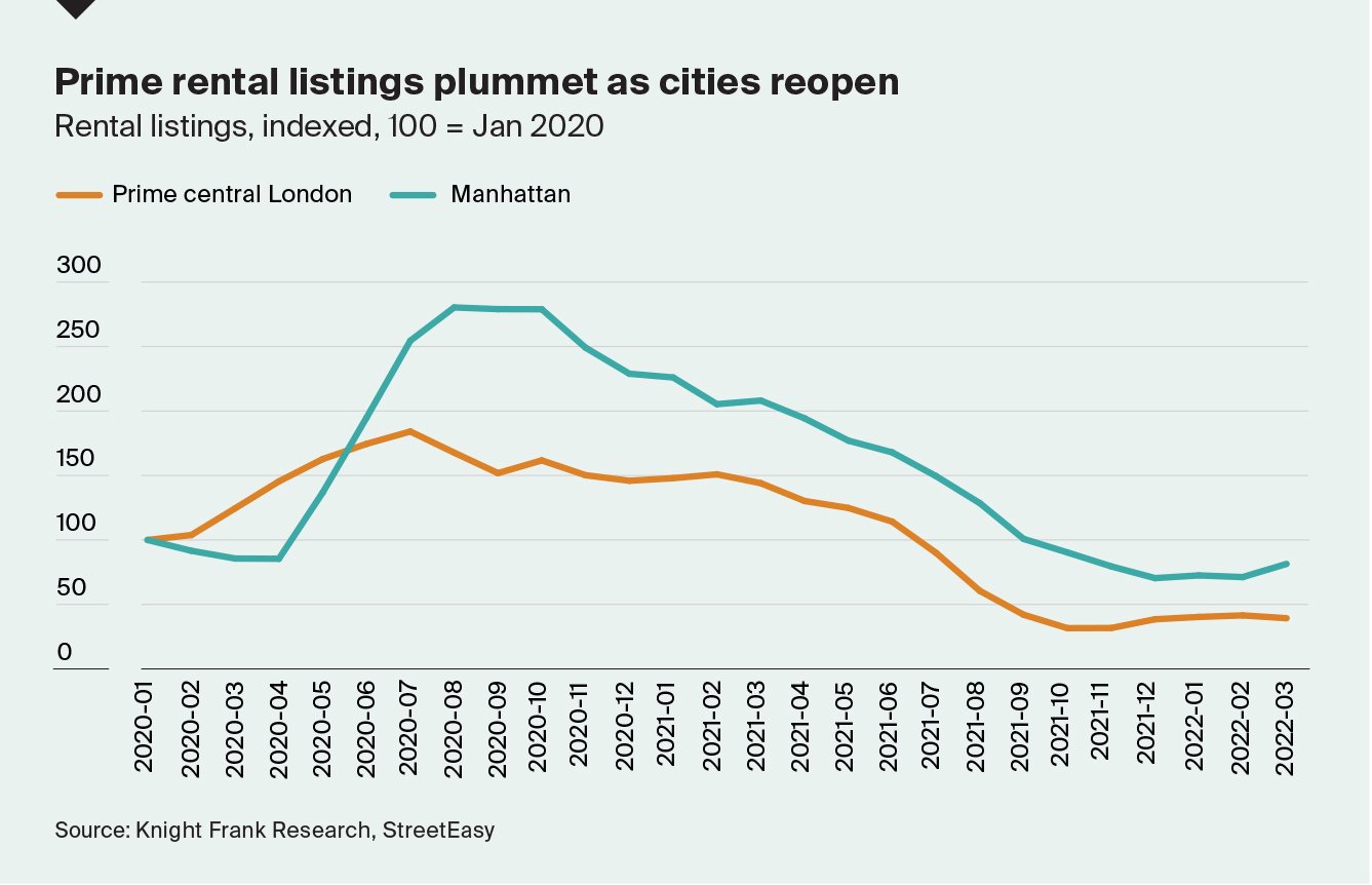 Toronto may prove one exception. Here, rental listings are down 23% in the year to March 2022 and Canada’s ban on foreign buyers may push demand higher as those relocating from overseas are forced to rent, not buy.