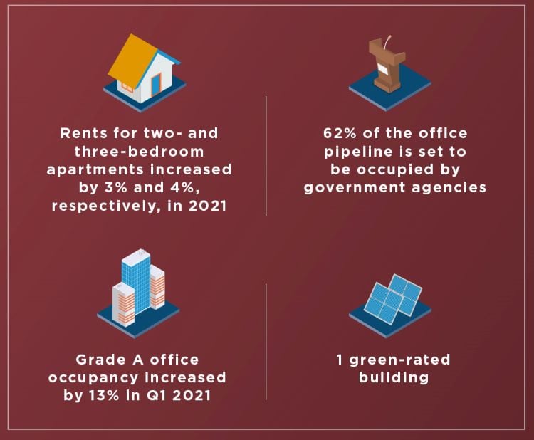 The rising demand for offices is driving a dearth of prime space for immediate occupation. This shortage will likely be eased with an expected 100,000 sqm supply pipeline in the next 12 to 24 months, although 2% of this is earmarked for owner-occupation by various government agencies.