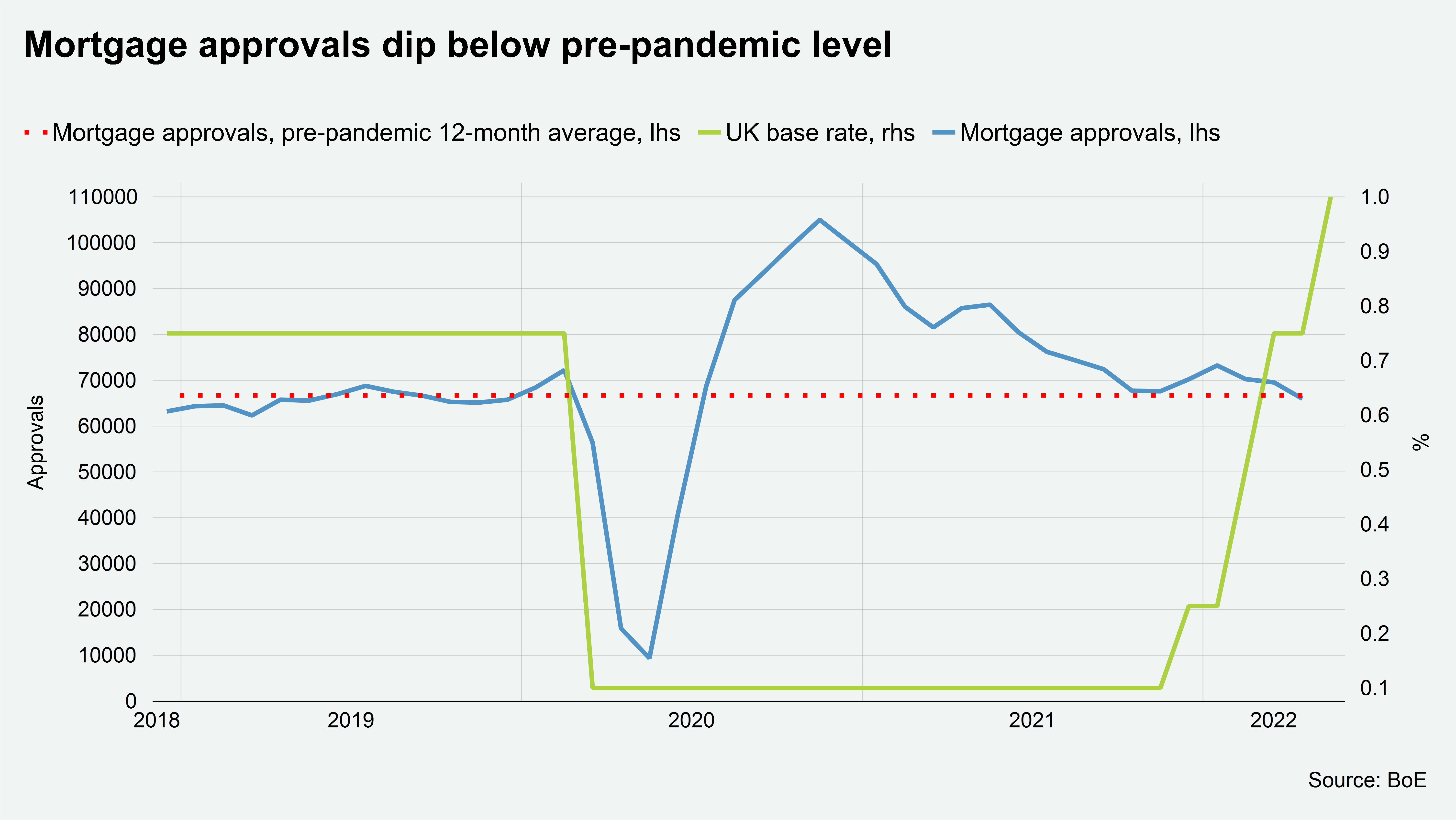 Mortgage rates continue to tick up and leading indicators suggest there is more to come. Swap rates are a reliable barometer for the path of mortgage rates and the 5-year swap had moved from 2.15% at the end of March to 3.13% ahead of the BoE’s latest decision.