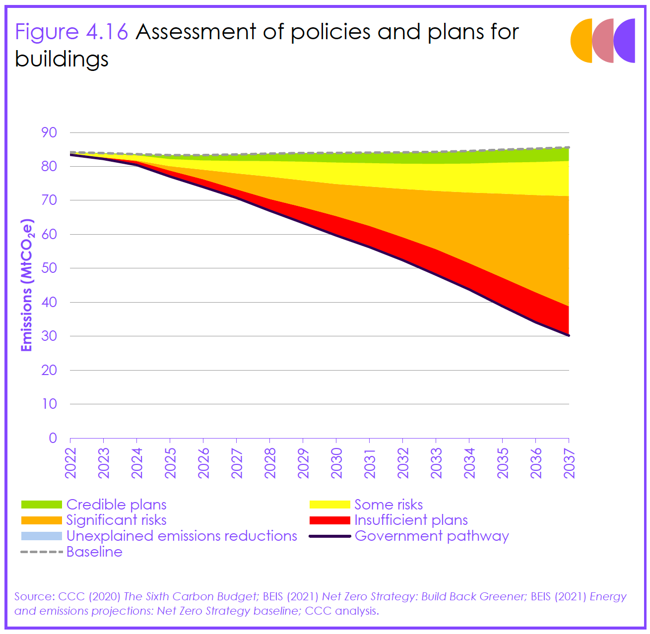 The chart below says it all. The solid black line represents the government's pathway to net zero and the dotted black line represents the baseline. The green pathway is covered by credible policies introduced and implemented. The rest are gaps, the most significant of which relate to energy efficiency in existing homes. There are policies in most other areas, but they have "significant" delivery risks.