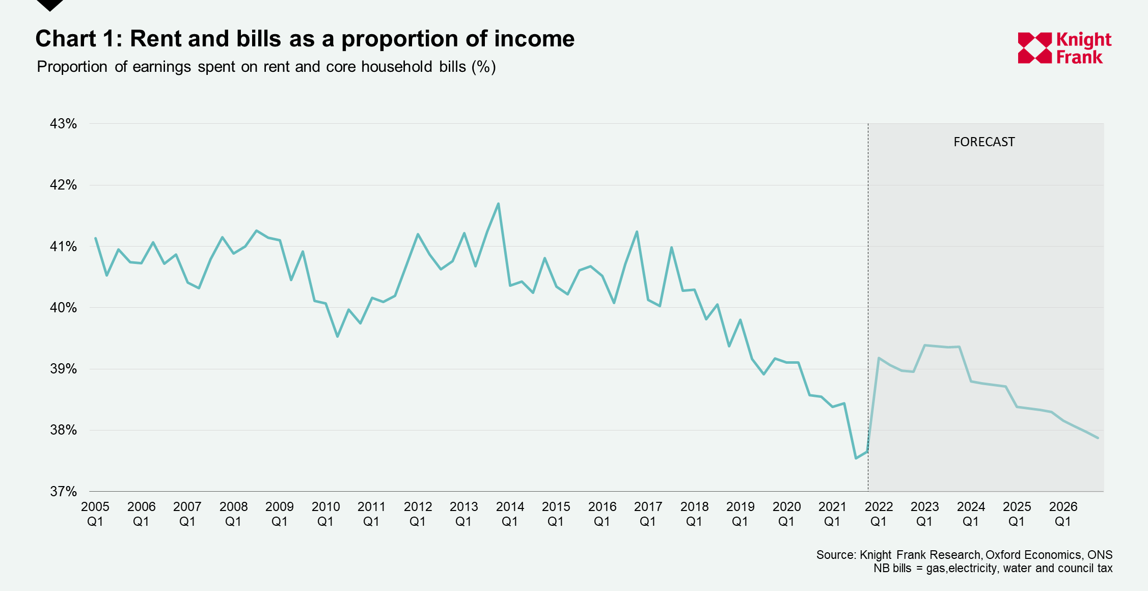 Strong wage growth relative to rents in recent years has been a contributor, and the proportion of earnings spent on rent has been steadily declining in recent years (see chart). Our research indicates that the average household spent 37.5% of their pre-tax income on rent and bills in 2021, down from a high of 42% in 2013. This figure, however, is expected to rise; Knight Frank forecasts that the proportion of earnings spent on rent and bills will spike at close to 40% in 2022 and 2023. Add in the prospect of rising food and transport costs on top, and there is the potential for affordability to be pushed to less sustainable levels.