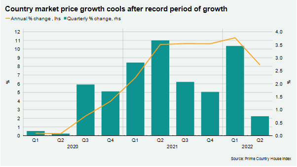 Price growth slowed in the UK country house market in the three months to June, as buyers become more circumspect against the backdrop of rising living costs and supply continued to normalise.