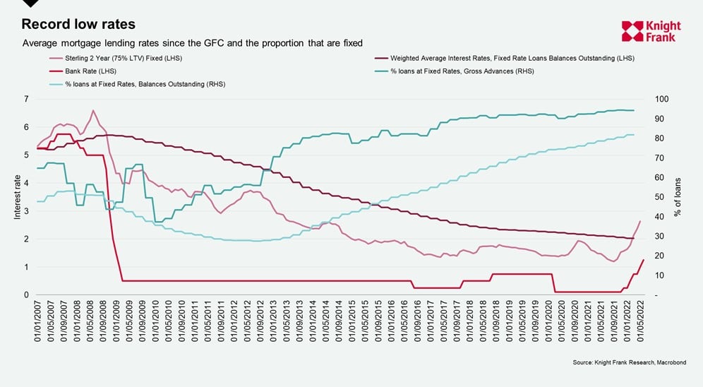 More than 90% of borrowers have been locking in rates since 2017, according to statistics from the Mortgage Lenders & Administrators. Cumulatively, this means that almost 82% of outstanding mortgages are now on a fixed rate, up from less than 30% in 2013, and the average interest rate for these has fallen to a new low of 2%. Many borrowers will be unaffected in the near-term.