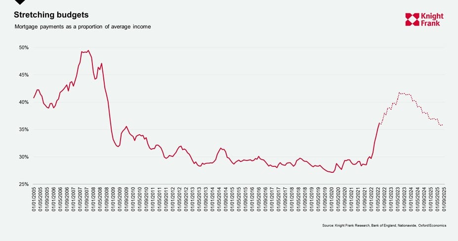 Our chart above illustrates that this will push mortgage payments as a proportion of average income back down to around 35%. Whilst still above the level seen in the last decade, this is low historically. If energy bills decline the picture looks one of easing budgets.