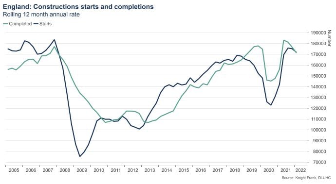 These are all issues housebuilders have been grappling with in recent months. So far, the supply of new homes has remained largely stable. Energy Performance Certificate (EPC) data points to around 240,000 completions in the year to Q2 2022, for example. Still below government targets, but in line with pre-pandemic delivery.