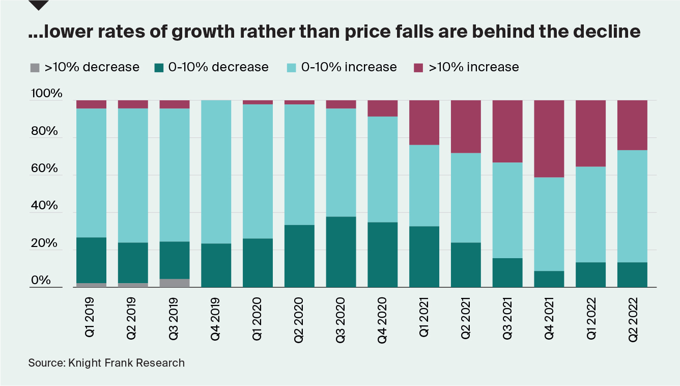 However, so far the story is one of lower rates of growth, not falling prices. The number of cities registering a fall in prices in the year to Q2 2022 is the same as last quarter – just six.