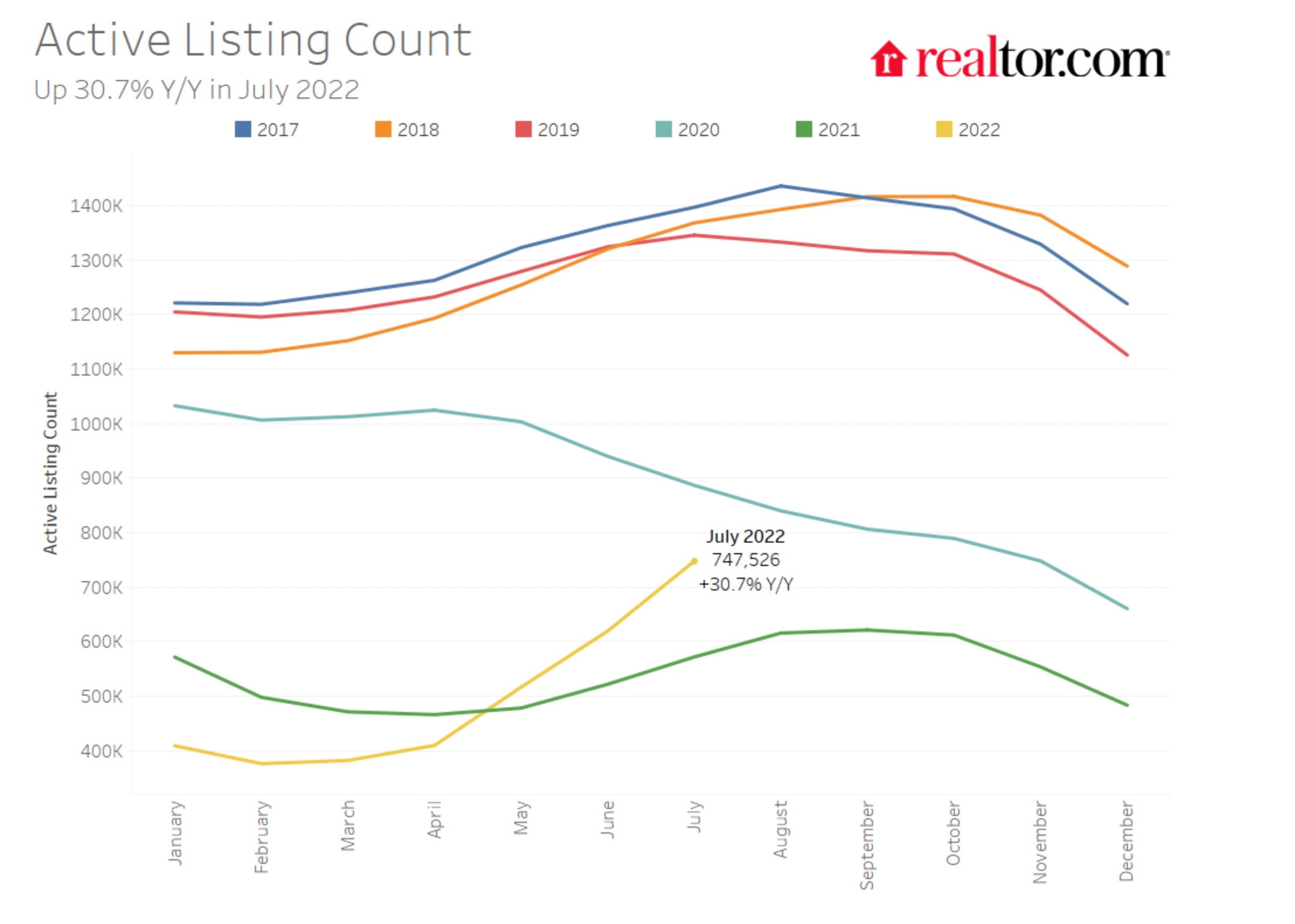 The US housing market is now rapidly moving back to something resembling more normal conditions (see chart from realtor.com). The national inventory of active listings increased by 30.7% in July compared to a year earlier, a record growth rate.
