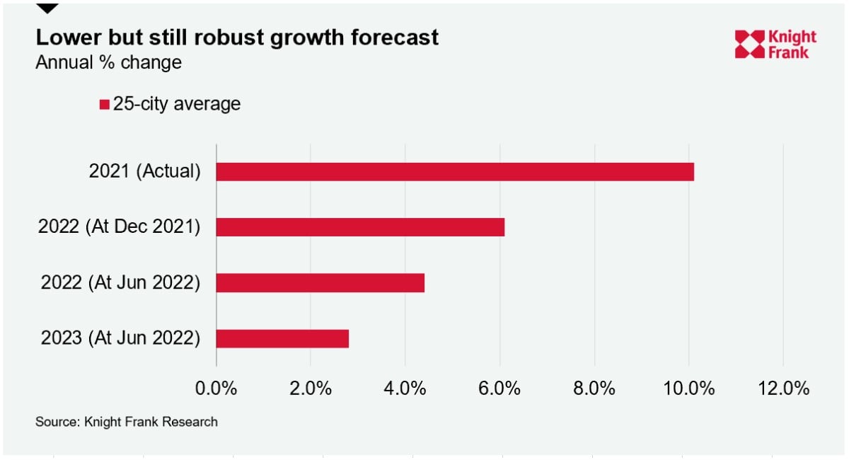 Knight Frank’s global research teams now expect prime prices to rise by 4.4% on average in 2022 across the 25 cities we track, down from 6.1% six months ago. That's still pretty strong growth, outpacing our prime index in nine of the last 10 years.