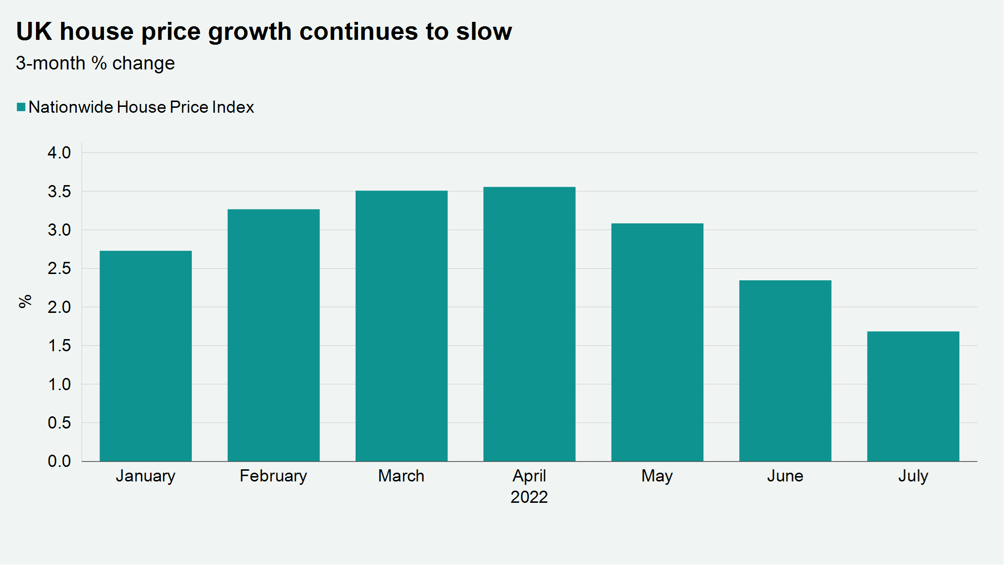 While Nationwide reported annual house price growth of 11% in July, the monthly change was just 0.1%. It saw the three-month change fall to 1.7% a reading that has been in decline since April (see chart).