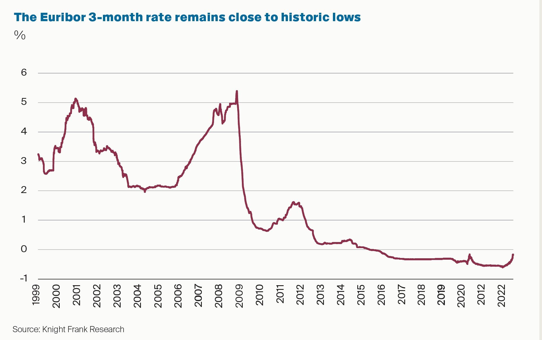 Secondly, lending rates are rising but in terms of the Euribor 3-month rate, the base rate that the majority of French banks track, we are still close to historical lows (see chart).