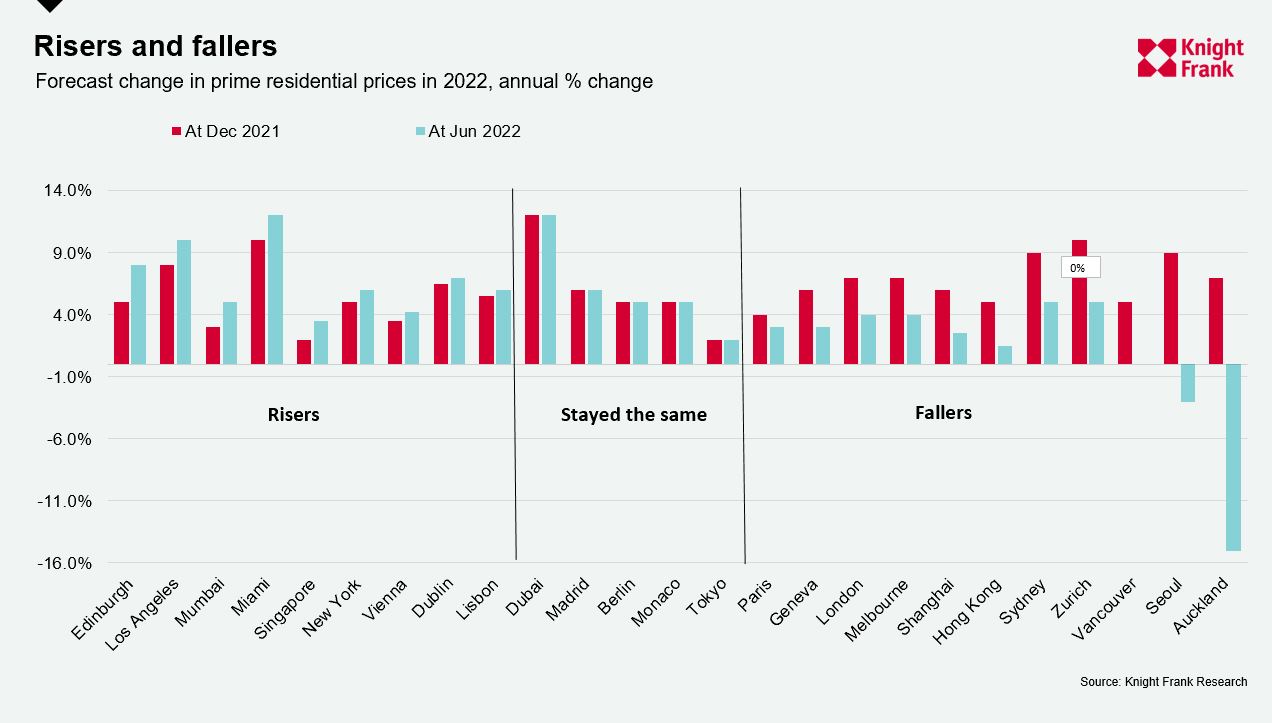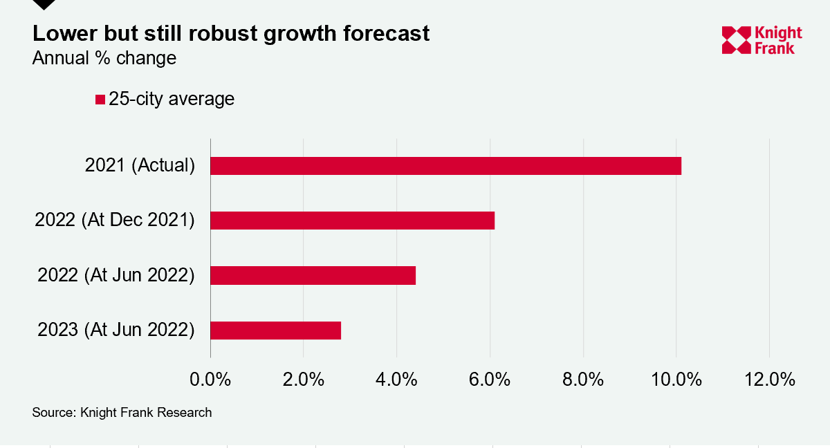Across the 25 cities tracked, Knight Frank’s global research teams now expect prime prices to rise by 4.4% on average in 2022, down from 6.1% six months ago.