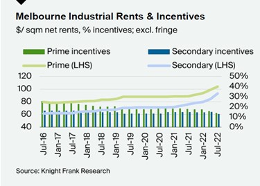 For prime industrials, the West precinct led the way with net face rents up 8.8% Q/Q (16.5% Y/Y) to $99 sqm. Rents in the East showed the largest Y/Y growth of 19.6%, with 6.8% this quarter alone to $110 sqm on the back of very tight supply.