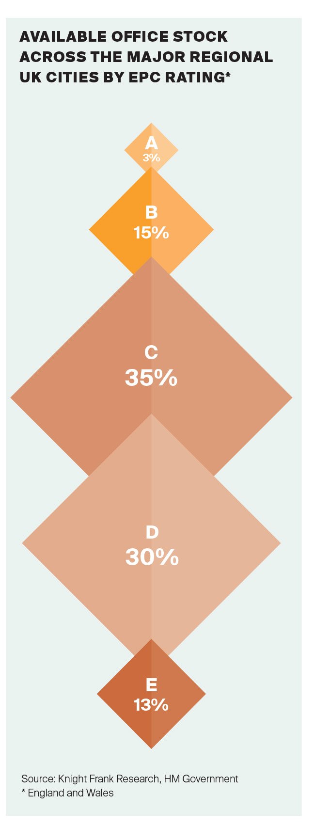 Unless there is a substantial change in current EPC ratings across office buildings, the market implications of these tighter regulations combined with the growing demand for top-rated office space will be significant. The research found that 82% of office stock being marketed in the major UK regional cities in December 2021 would fail to meet the proposed minimum rating. This means that refurbishment activity is sure to rise in the lead up to 2030, with offices where works are deemed economically unviable, subject to a change in use.