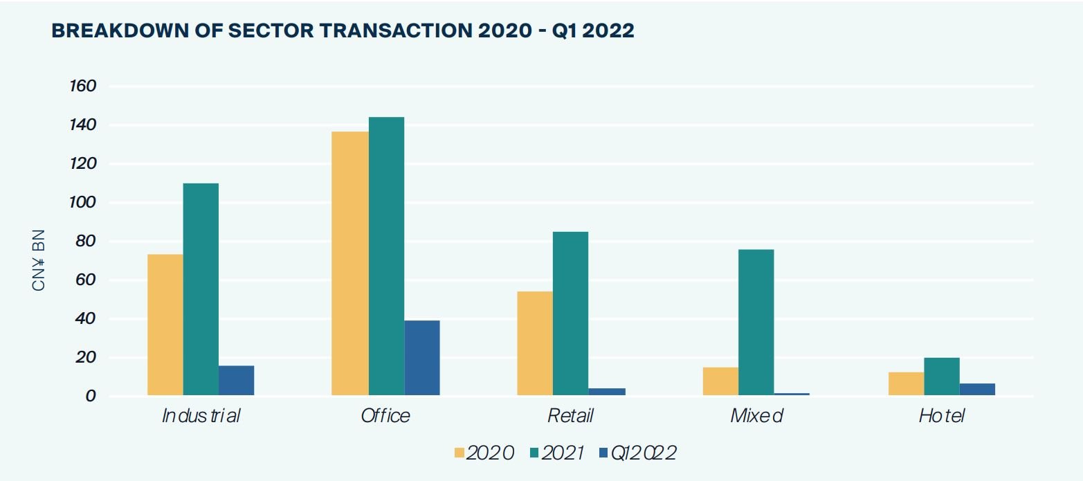 Offices have always accounted for the largest percentage of the transaction volume of the real estate investment market in China, reaching approximately 32.6% of the total transaction volume in 2021.