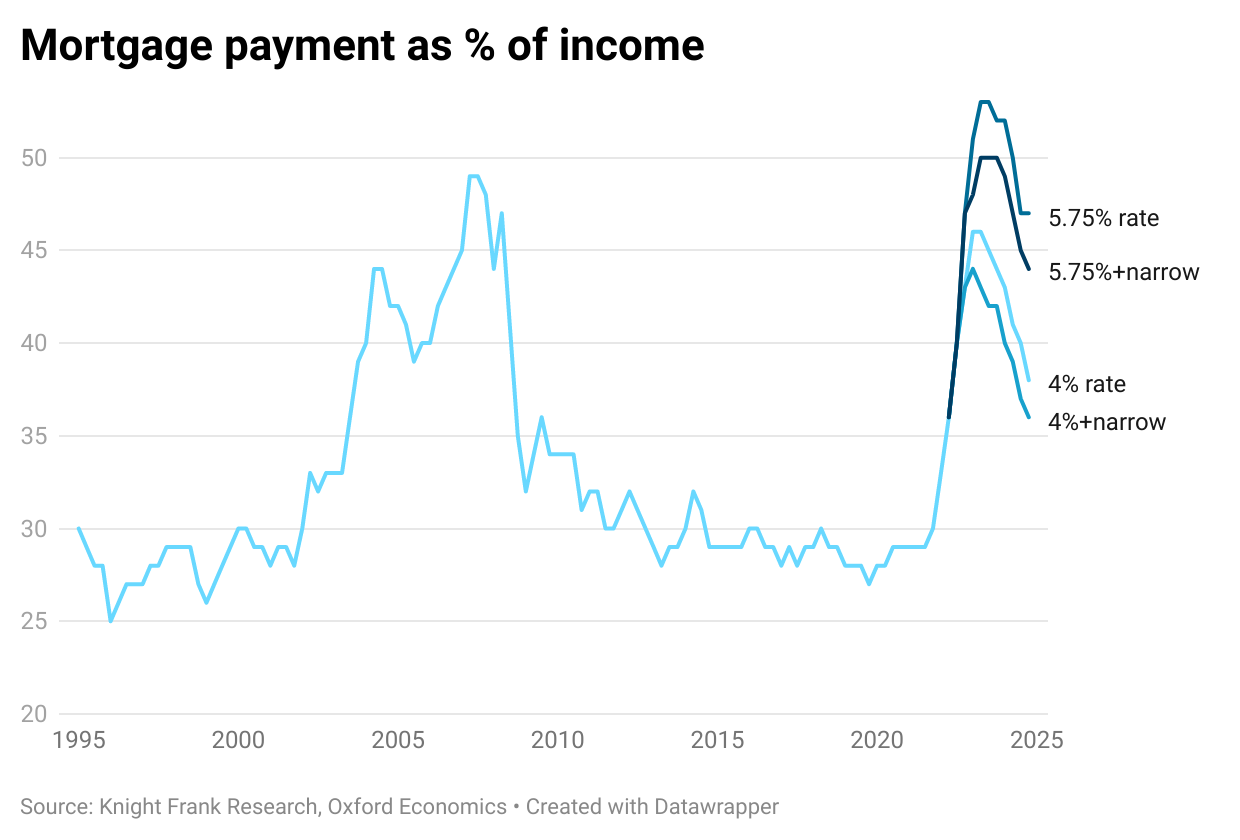 The average proportion of income spent on a new mortgage has hit a level not seen since 2008 at 39%. This is far below the 50% witnessed in 2007. We have crunched the numbers including average house prices, our latest forecasts, predictions for wages and the two interest rate scenarios, with and without spreads narrowing, to see what that would do to affordability.