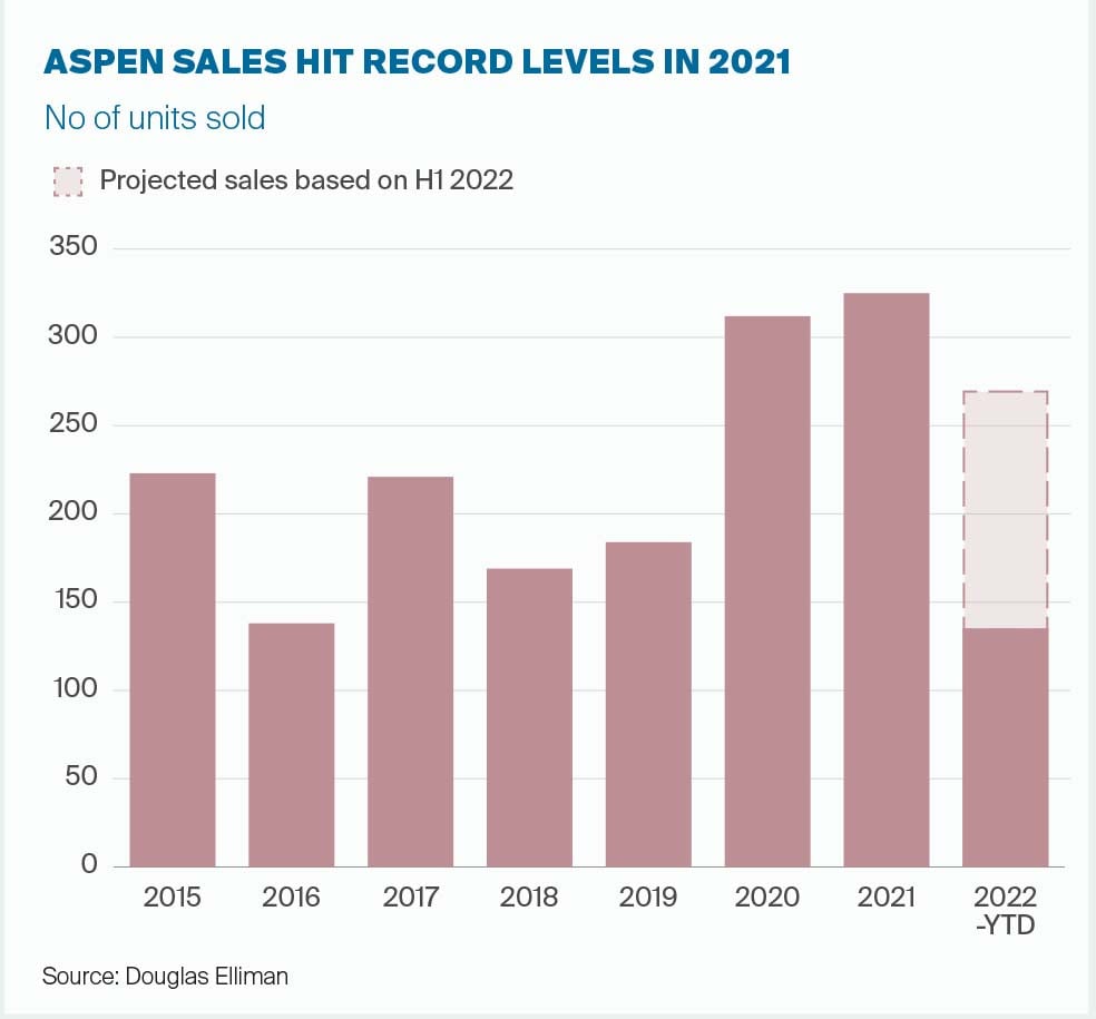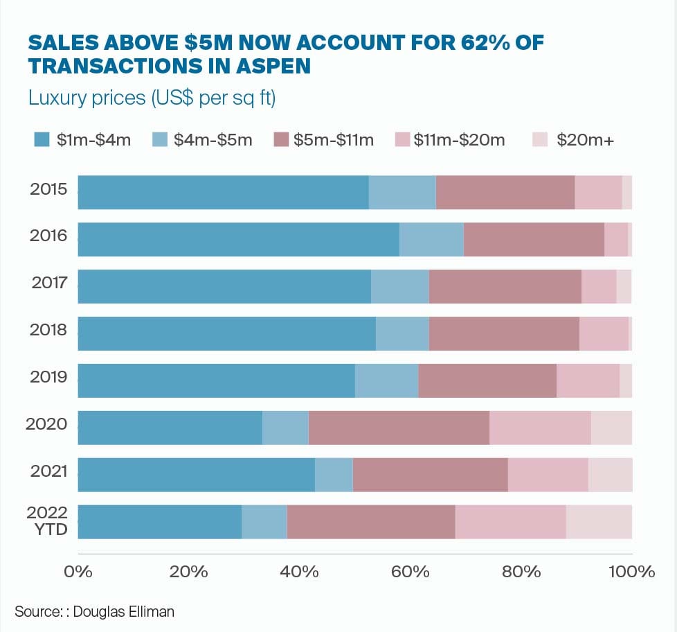 Due to the sustained lack of stock, prices remain robust, and off-market sales have increased. Over 62% of Aspen sales were above US$5 million in the first ten months of 2022, up from 39% in 2019, prior to the pandemic.