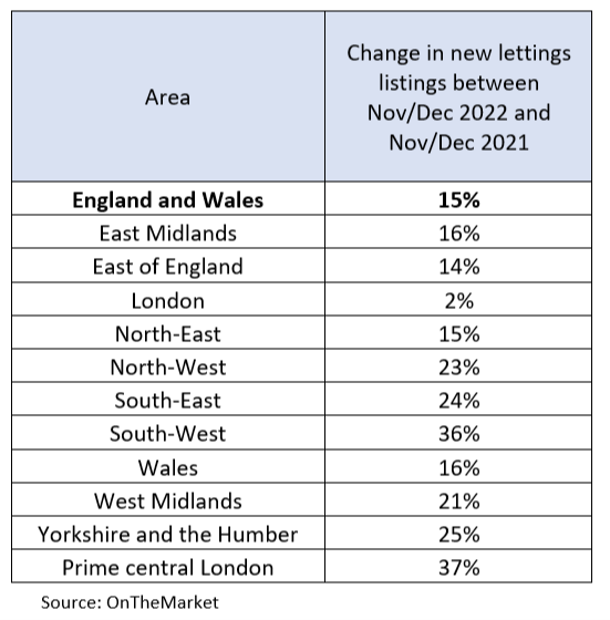 The number of new lettings listings in the final two months of last year was 15% higher in England and Wales than the same period in 2021, figures from OnTheMarket show.
