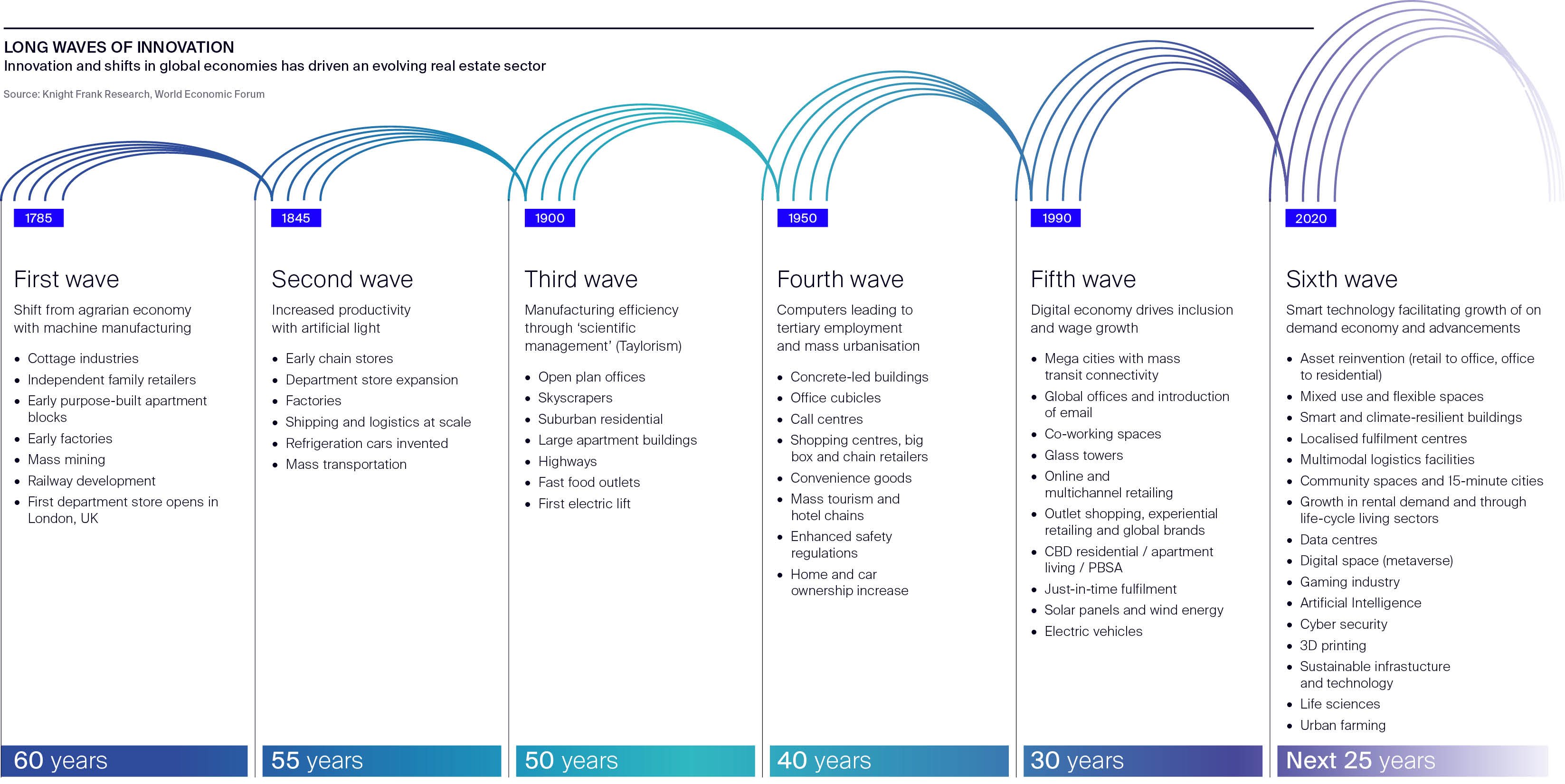 The sixth innovation wave, digitalisation, should bring rapid change, potentially through only a few real estate cycles. While many investors may go back to basics in search of liquidity and risk-off investing over the next 18 months, it is worthwhile not just examining the past but also to look forward to the cycles that lie ahead.