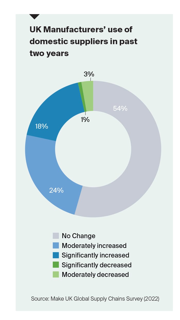 A survey by Make UK found that 42% of British manufacturing firms had increased their domestic supplier base in the last 24 months (up to the date of the study in early 2022). A similar proportion also said they planned to make further moves in this direction before 2024.