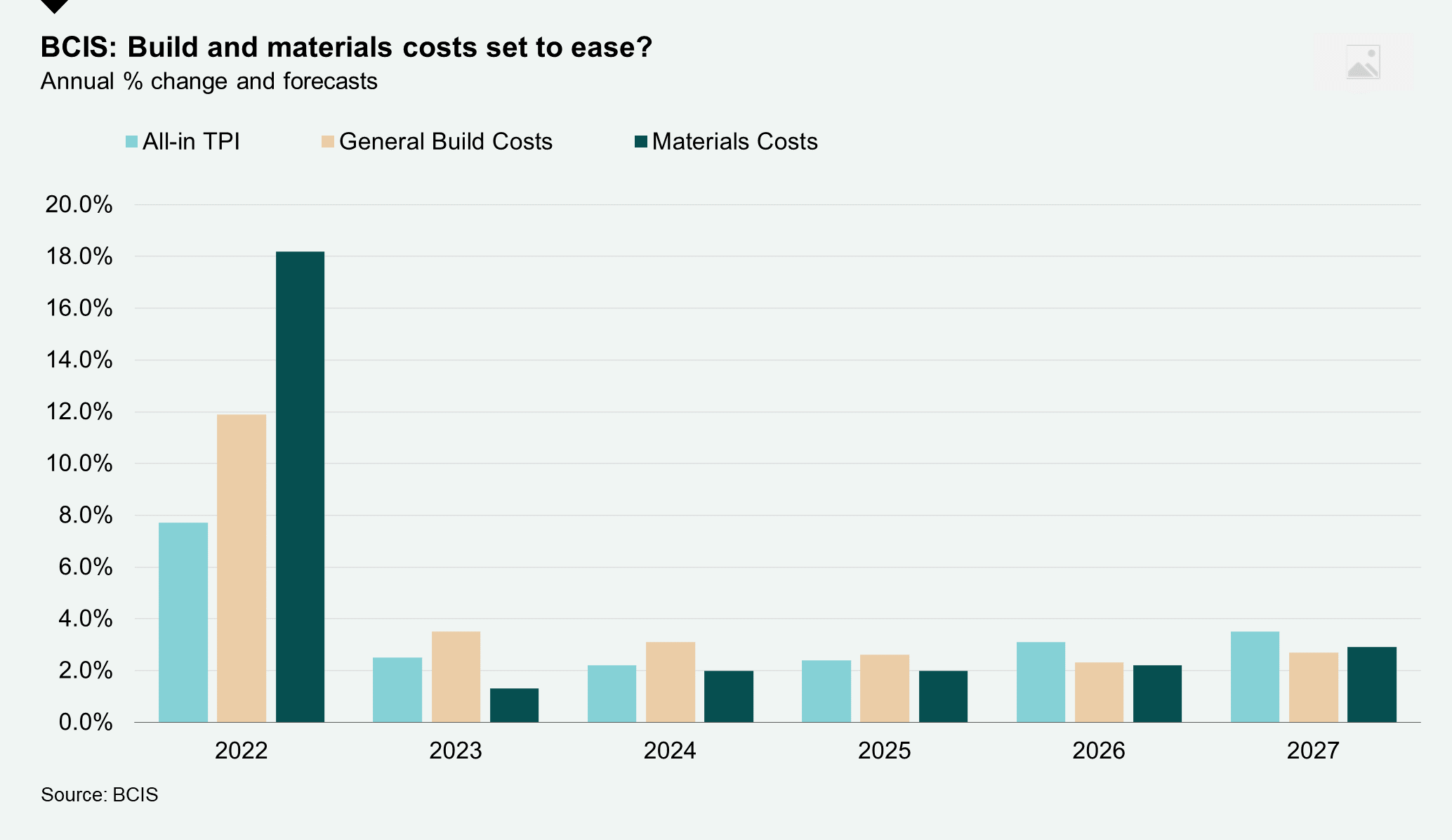 Build costs remain a big concern, though there are signs we may have passed peak inflation. Build costs increased 9.7% annually at the end of 2022, according to the BCIS General Building Cost index, down from a peak of 16.0% in June.
