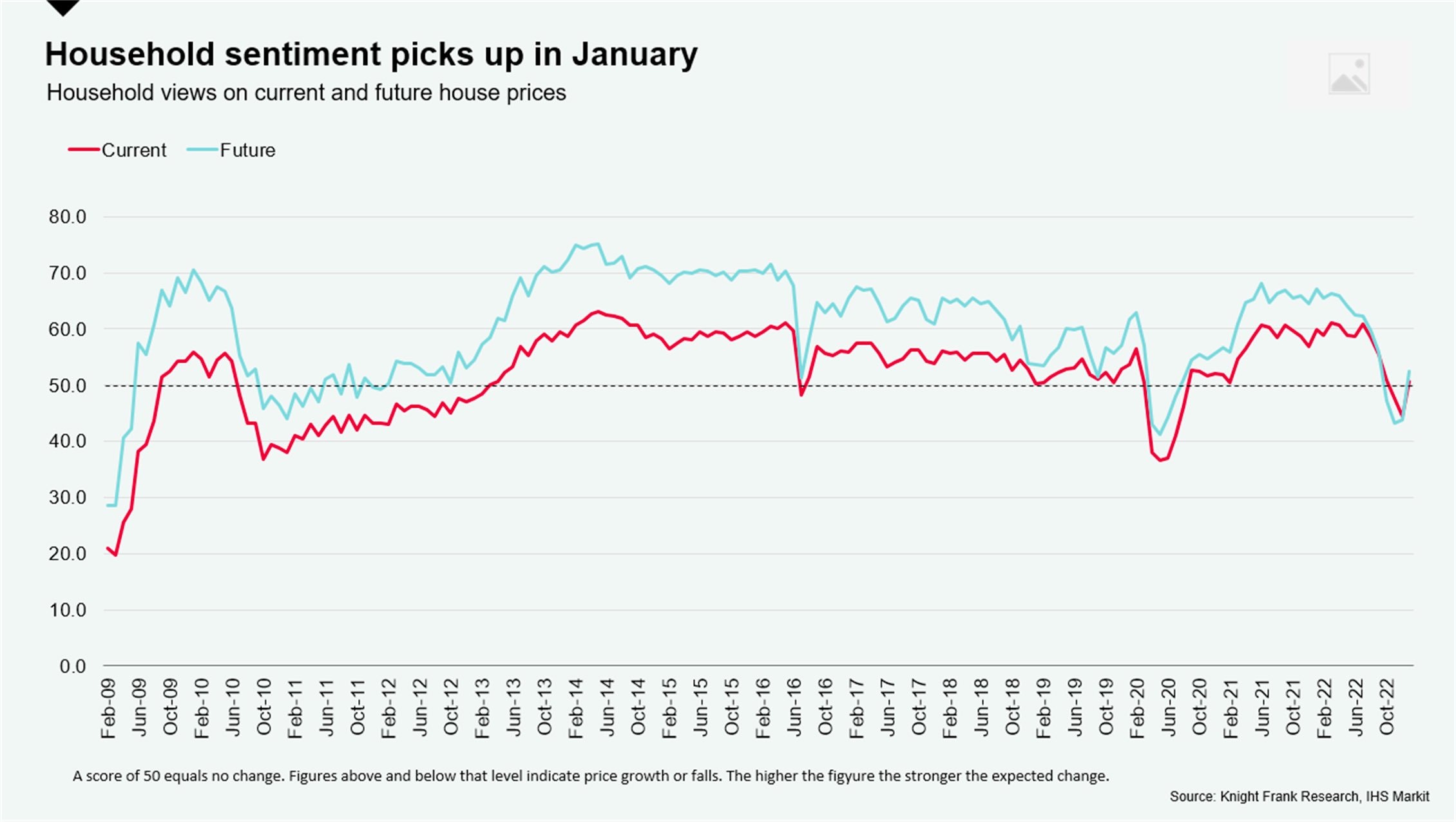 The December slowdown started early this year in the wake of the mini-budget, but Rightmove data published early last week suggested the traditional new year rebound had been particularly strong. The latest survey from IHS Markit confirms that household views on the current trajectory of house prices rebounded into positive territory following two consecutive contractions (see chart). Views on the future trajectory of house prices also moved into positive territory following three consecutive monthly contractions.