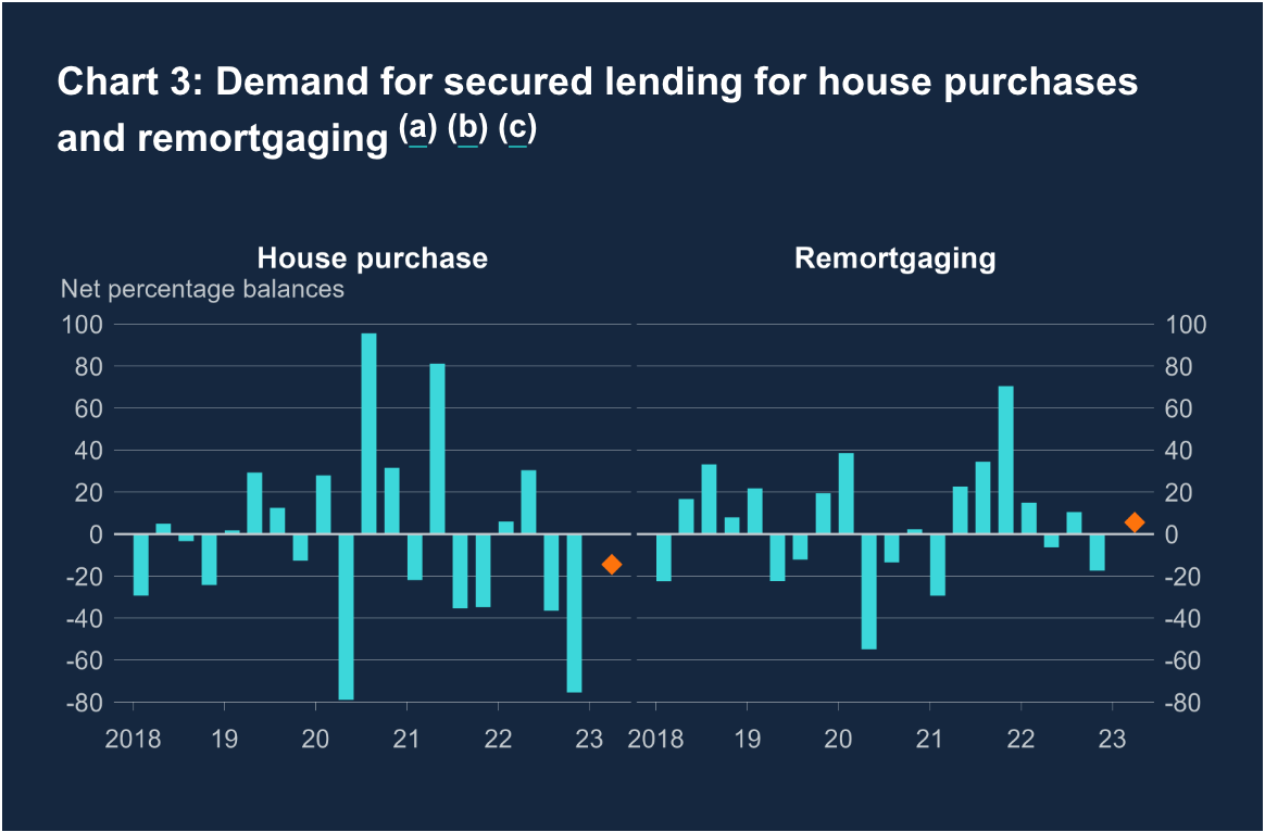 The Bank of England's quarterly Credit Conditions Survey of lenders illustrates the scale of the drop off in mortgage lending during the final quarter. The drop in demand for mortgages for house purchase was particularly pronounced (see final blue bar on left chart) and is expected to ease further during Q1 (see orange diamond), though only marginally in comparison.