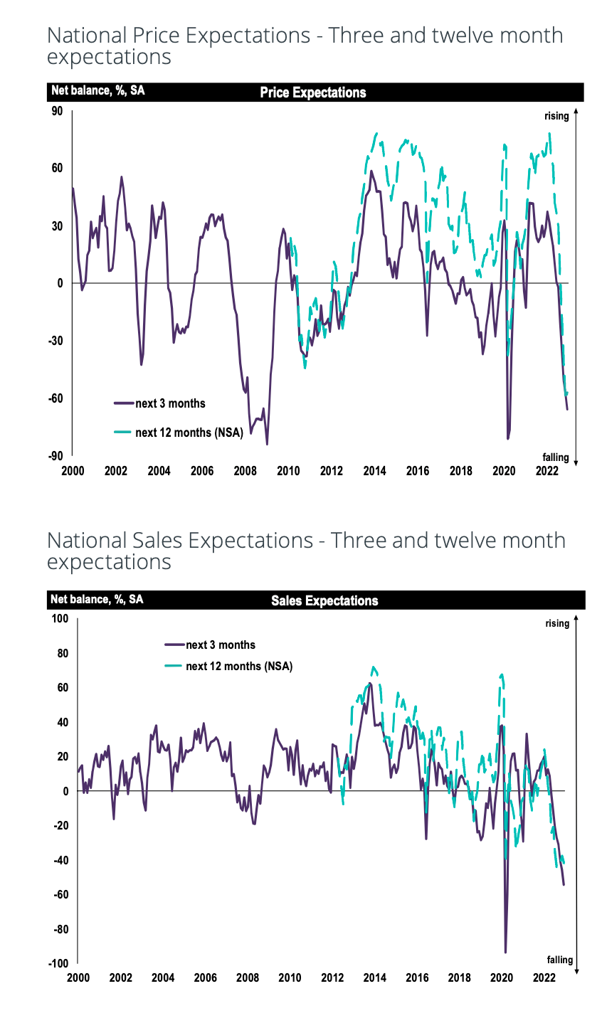 The downward momentum in sales became further entrenched across virtually all parts of the UK over the month, with respondents in the North West of England, Scotland, Wales and London all citing a particularly subdued month for activity. Near-term sales expectations turned a little more downbeat, posting a net balance figure of -54% compared to -46% last time (see chart).