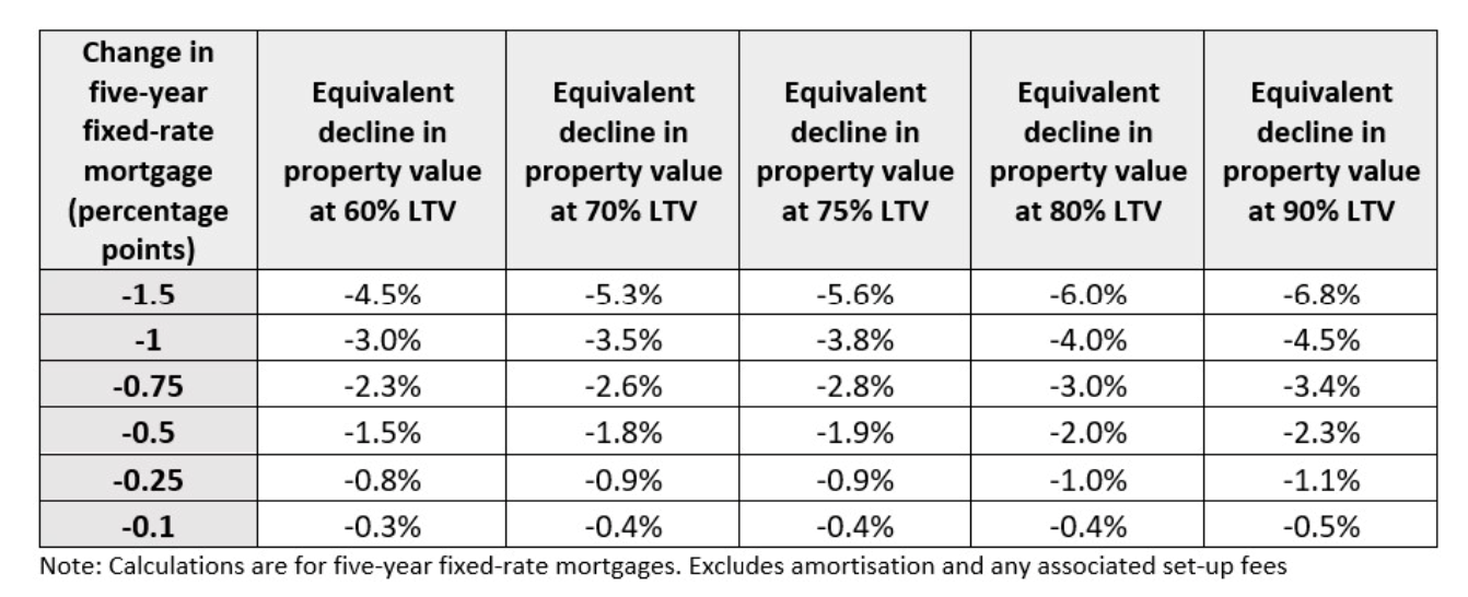 For anyone seeking a five-year fixed-rate mortgage at an LTV of 90%, for example, a decline of 1 percentage point on the rate (for example from 6% to 5%) is the equivalent of 4.5% of the property’s value.