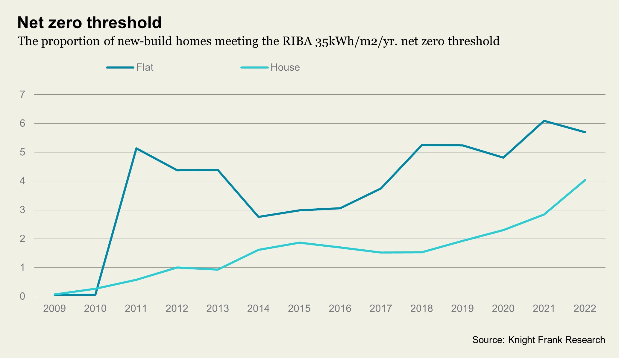 Encouragingly, when we dig deeper the proportion of new builds meeting the 35kWh/m2/yr. or net zero threshold has risen from under 0.1% for both houses and flats in 2009, to 4% of houses and 5.7% of flats in 2022.