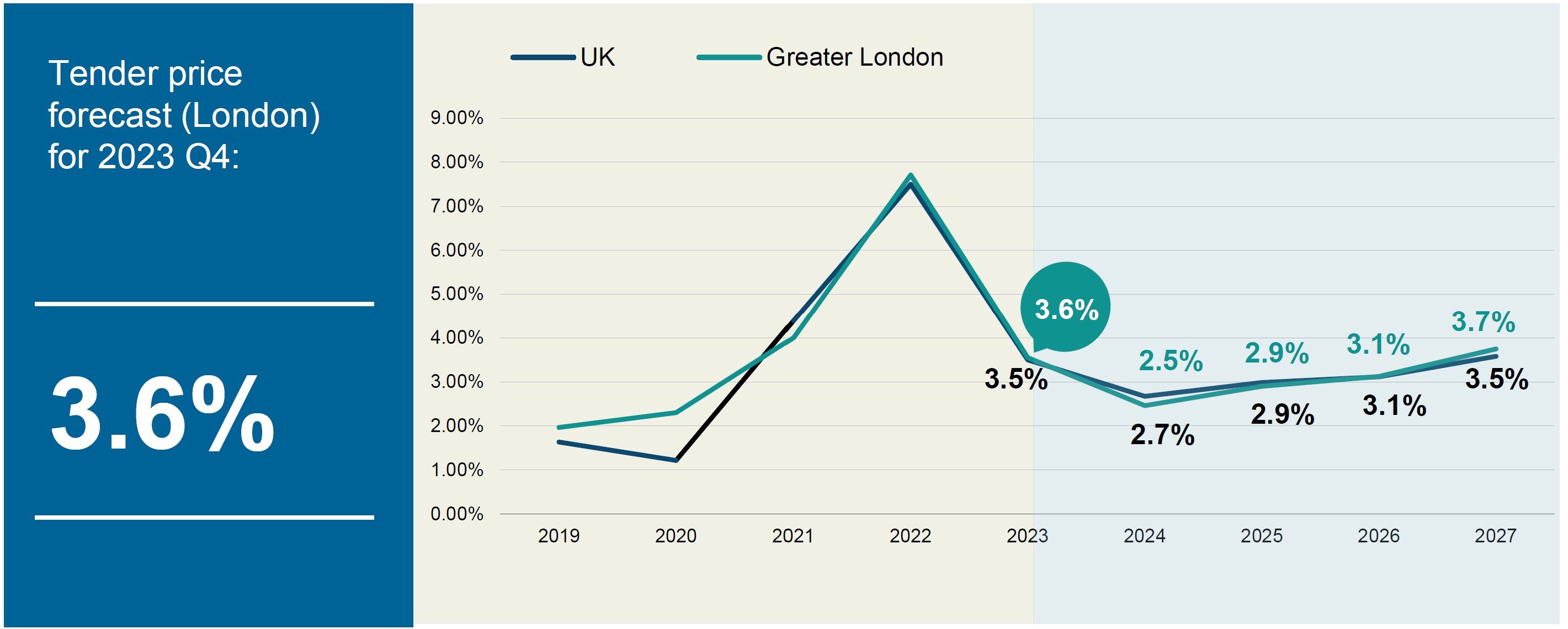 Positive near-term outlook for tender price inflation (TPI) – our latest forecast for London TPI –shows prices rising by 3.6% in 2023 and below or at 3% between 2024-26. These represent the lowest levels of TPI since 2021.