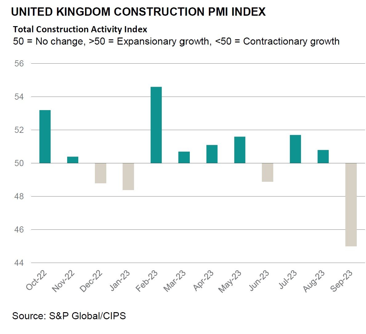 The headline CIPS construction PMI fell to 45.0 in September, indicating contraction, from 50.8 the previous month. There were considerable falls in residential land commercial output whilst the near-term outlook is hindered by falling new orders.