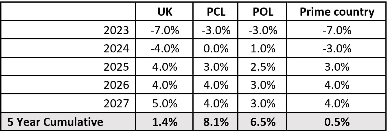 We have left our forecasts for PCL unchanged but expect a slightly smaller fall (-3% rather than -4%) this year in prime outer London (POL) and a marginally stronger recovery from 2026. POL continues to benefit from demand that is more domestic and needs-driven.
