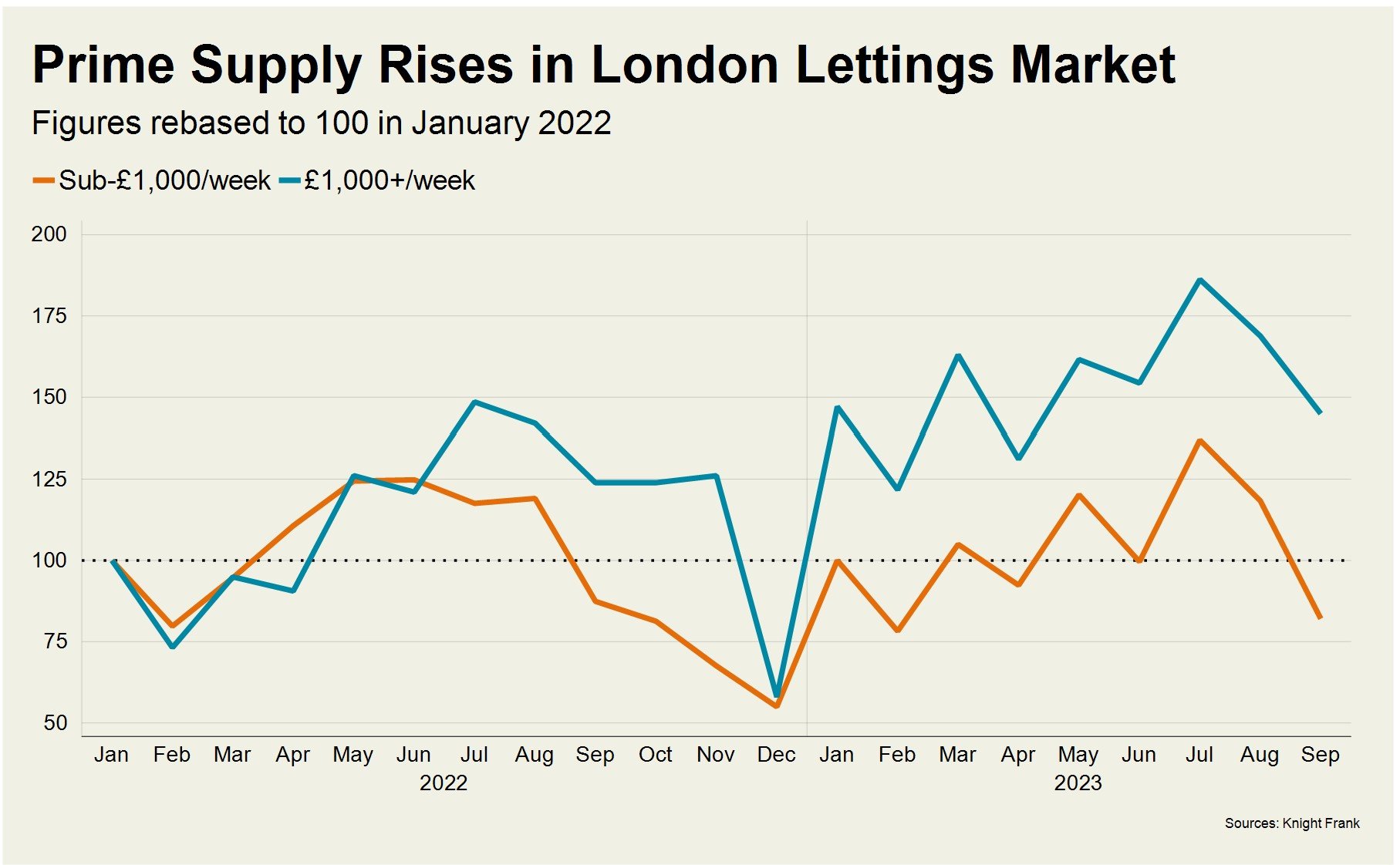 The number of instructions for lettings properties valued above £1,000 per week in London was 45% higher in September than January 2022. Meanwhile, below that figure, there was an 18% decline.