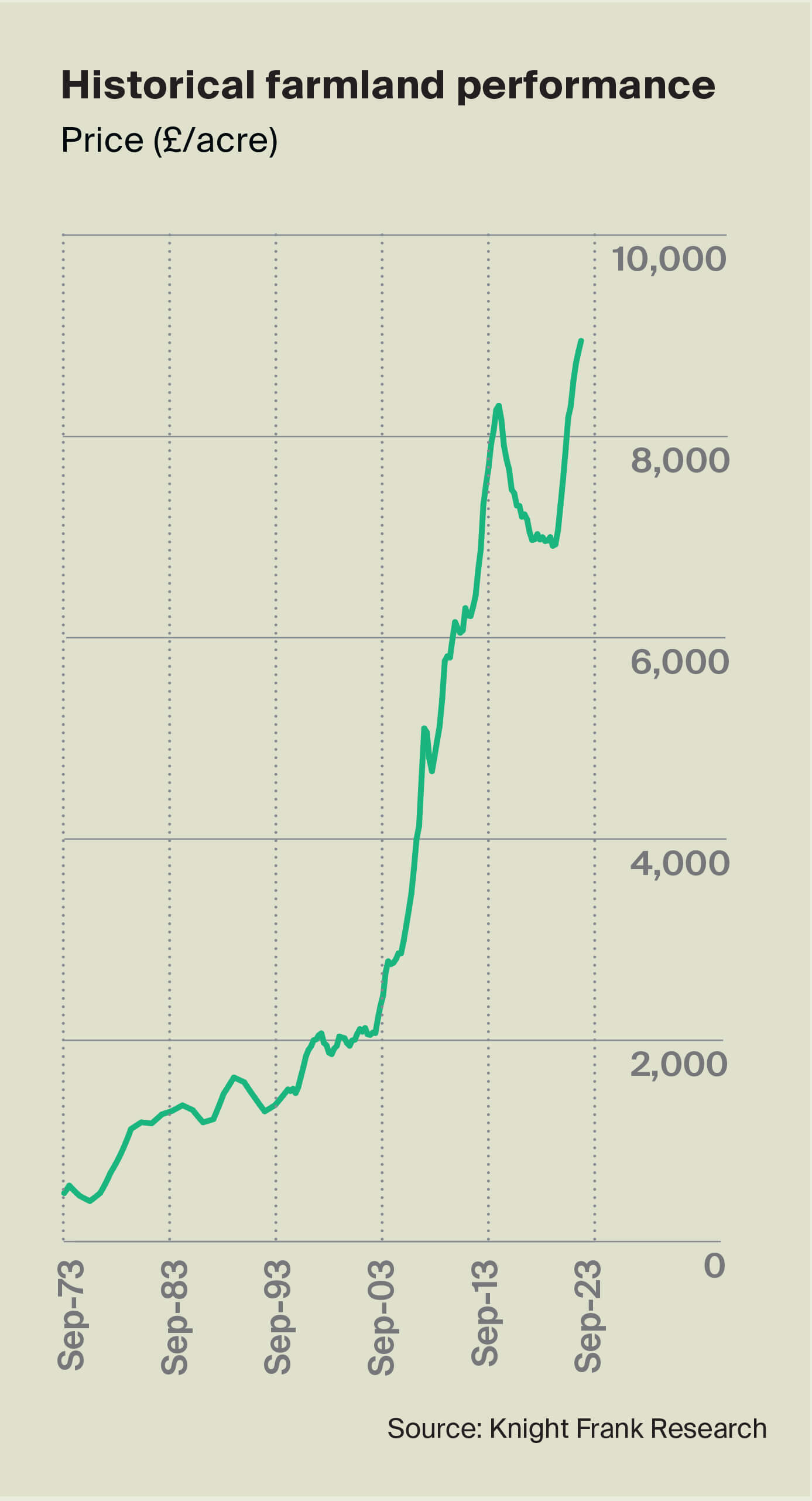 The price of bare agricultural land in England and Wales rose by 1% to hit another record high in the third quarter of 2023, according to the latest instalment of the Knight Frank Farmland Index.