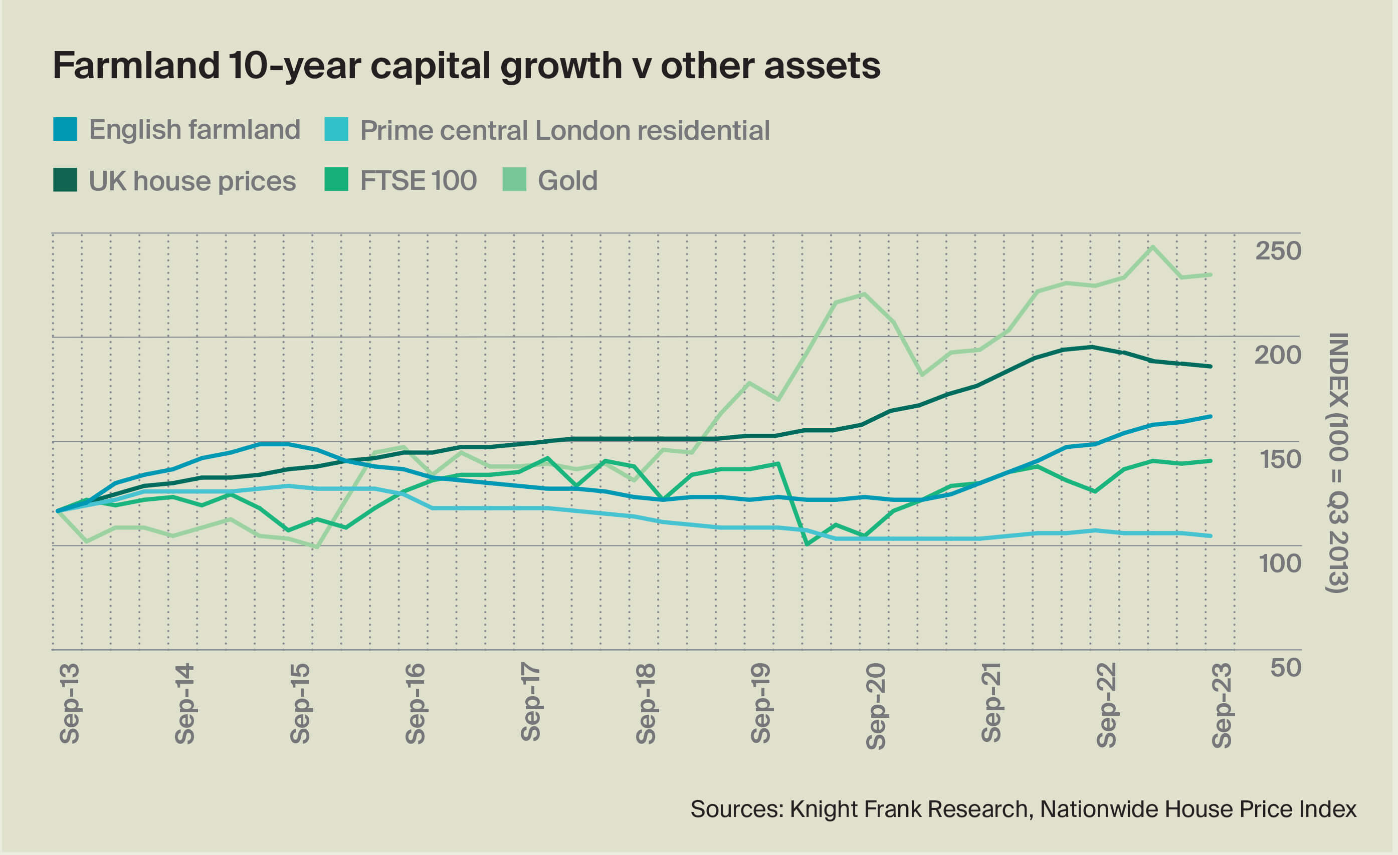 Of the other asset classes we track, only the FTSE 100 index (+10%) has outperformed farmland over the past 12 months. Looking back five years, farmland values have risen by 27%, bested only by gold (+67%).