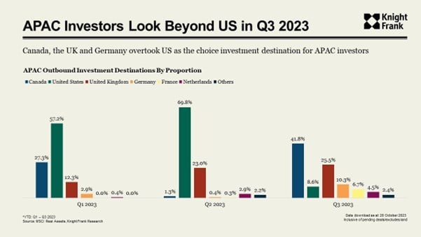 Knight Frank's Q3 2023 APAC Capital Markets report on capital flows showed a double-digit decline in commercial transaction volumes from APAC to North America and EMEA on both a yearly and quarterly basis.