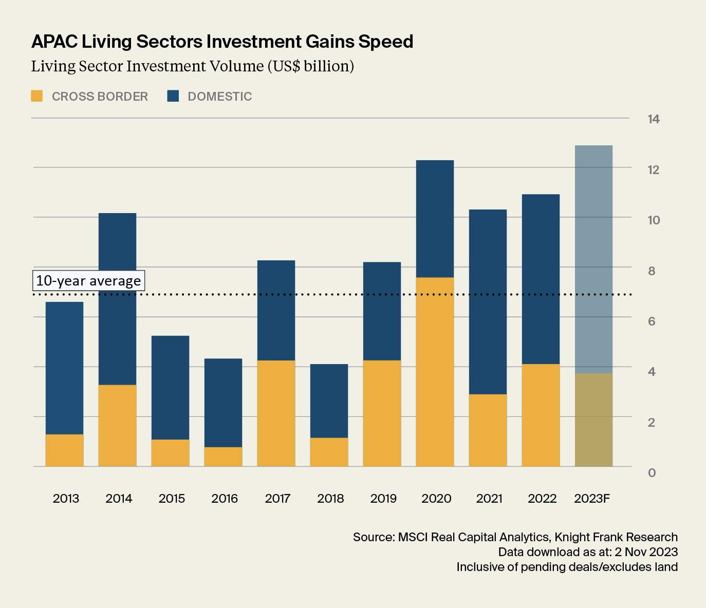 Asia-Pacific's living sectors industry is thriving, with new trends catalysing its rapid growth. Opportunities in this segment prevail, appealing to investors seeking fresh asset classes to enhance their portfolio diversification. With substantial deals in the pipeline, the total Asia-Pacific multi-family investment volume for the year is set to surpass the previous high in 2020, with domestic activities dominating the scene.