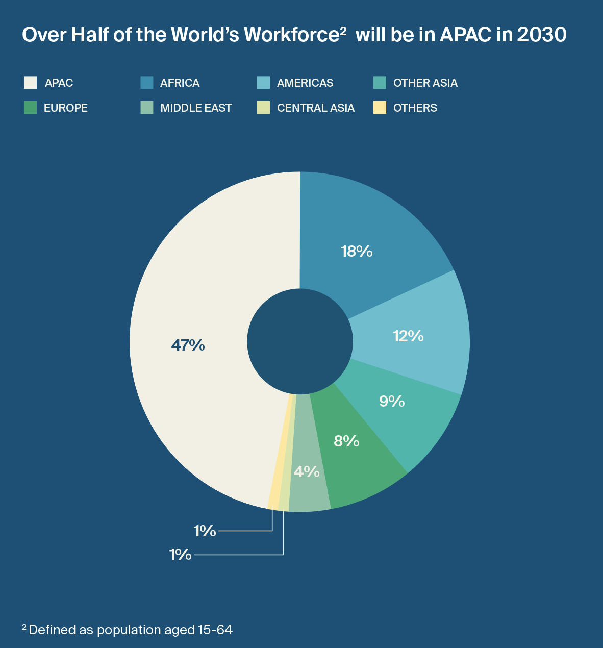 Paired with conducive policies, the young, fast-growing labour pools in South Asia and most parts of Southeast Asia are expected to fuel the region’s competitive advantage continually. By 2025, about 68% of the population in the ASEAN region will be of working age. Unlike more mature countries, the region’s working population surpasses its older dependents, spurring economic expansion, growing consumer and investment spending, and wealth accumulation.