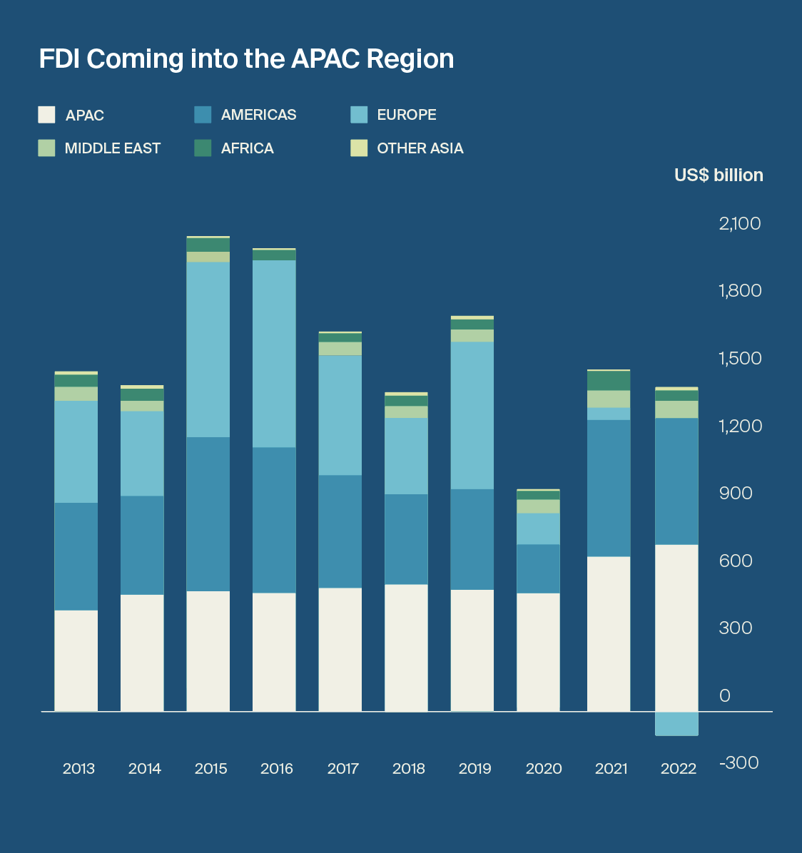 Foreign direct investment (FDI) inflows from UNCTAD show a tectonic shift in investments towards Asia-Pacific following the pandemic. While inward FDI fell by 12.4% globally in 2022, those into the region have bucked the trend to rise by close to 8%. The region accounted for 55% of global inward FDI in 2022.