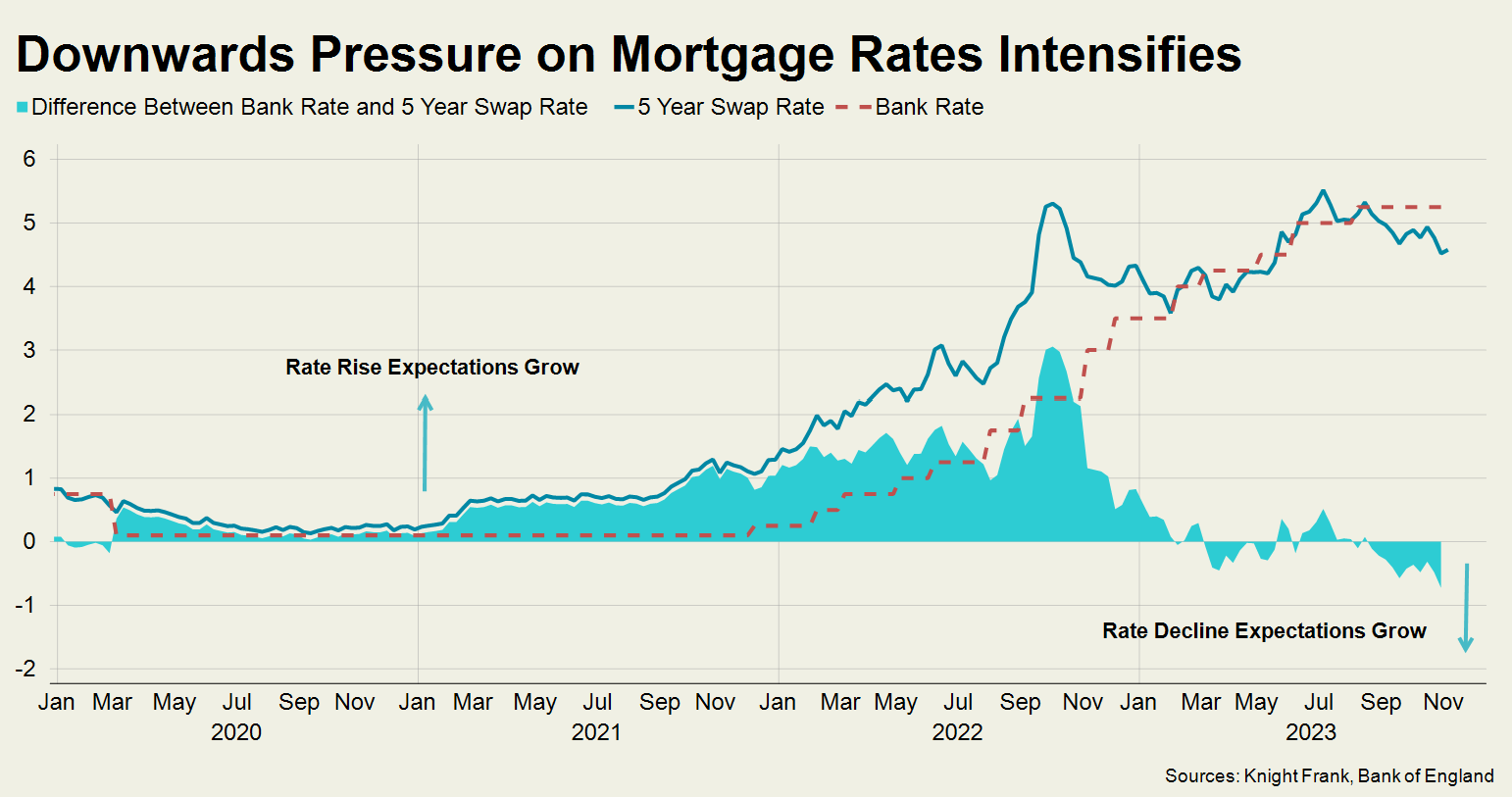 Both would provide differing boosts to housing market sentiment, which is already improving as mortgage rates continue to tick lower. See Tom Bill's Monday update for more on that. The fact the five-year swap rate is currently lower than the bank rate (as the chart below shows) demonstrates that financial markets believe the direction of travel for borrowing costs is down.