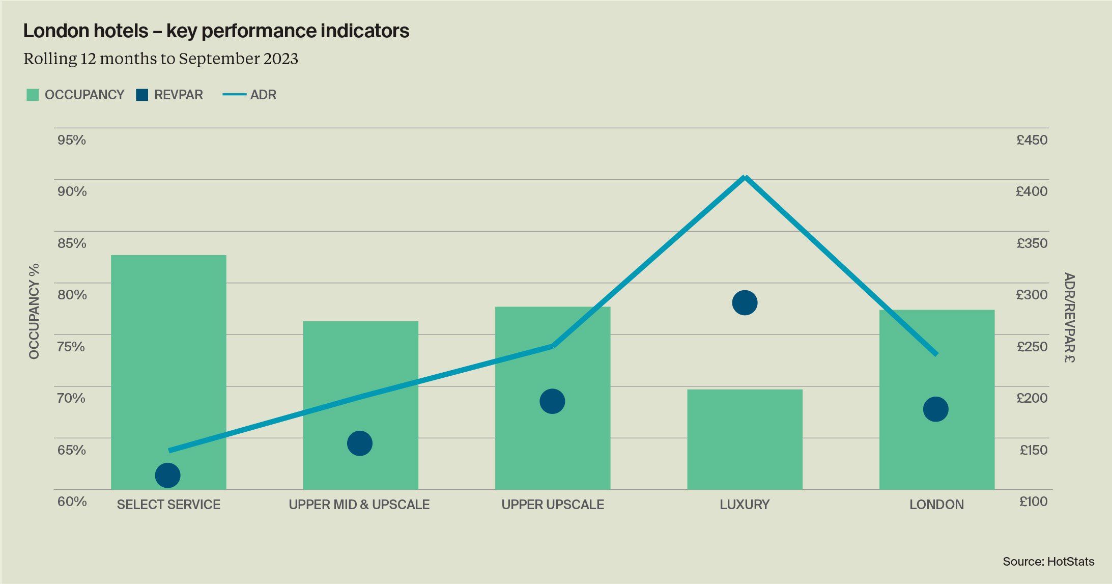 London’s 12-month occupancy to September 2023 has increased by 16 percentage points to reach 77% - ahead of Regional UK for the first time since the post-pandemic recovery began and in line with historical trends. Meanwhile, the high inflationary environment has supported pricing, with London’s ADR rising by 8% over the same period and is ahead of its 2019 performance by 22%. The ongoing recovery of overseas visitors has been the key driver behind the significantly boosted occupancy levels, with trading further supported by strong growth in corporate and meetings and events business, as well as continued robust leisure demand.